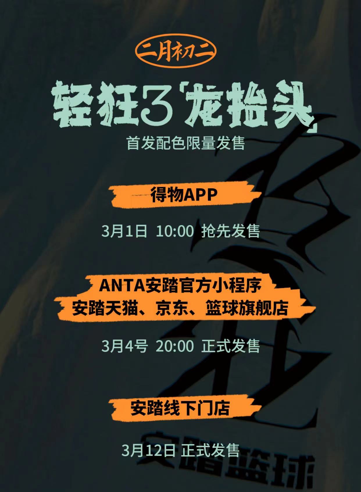 目前,全新轻狂 3 龙抬头 3 月 1 日已在得物 APP 抢先发售,3 月 4 日 20 : 00 还将在安踏官方小程序、安踏天猫、京东、篮球旗舰店正式发售,发售价为 ¥ 799 元。