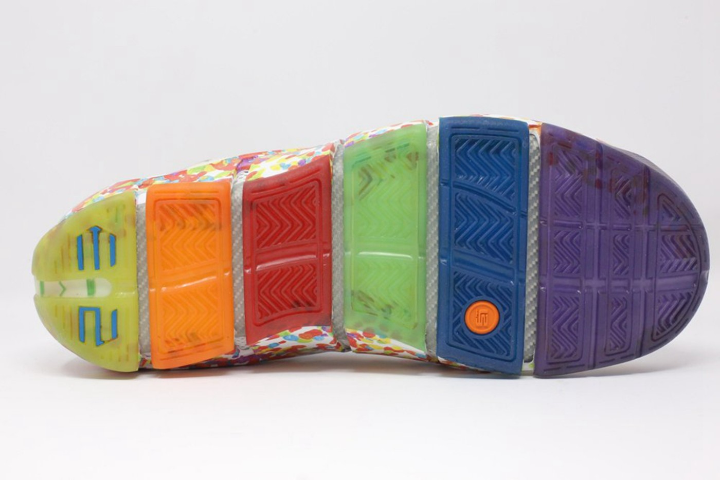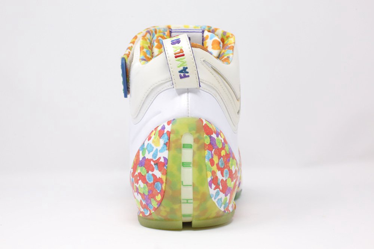 白色为主的鞋身搭配五彩缤纷的斑点图案,以抽象的方式呈现出水果麦片的图案。