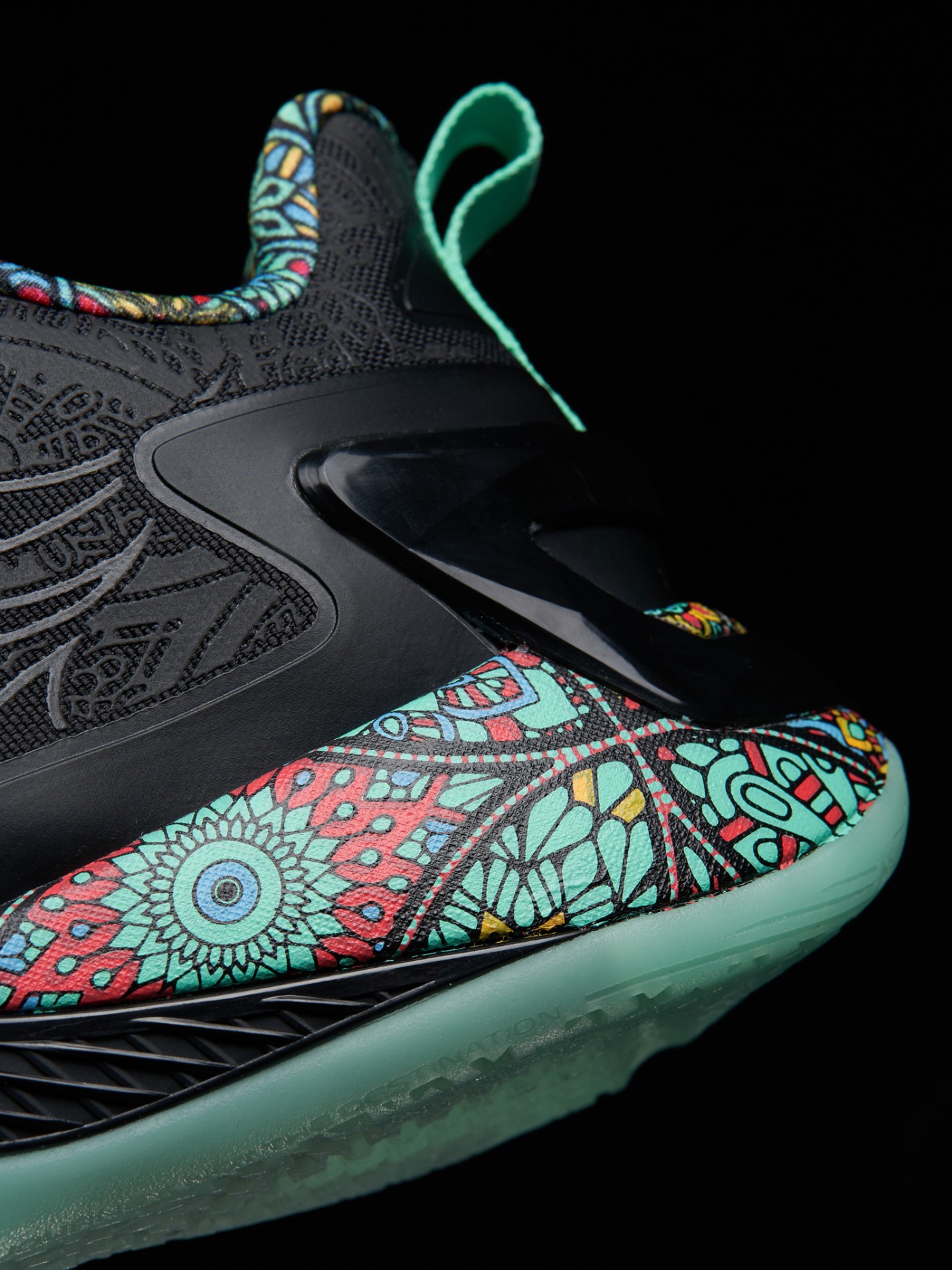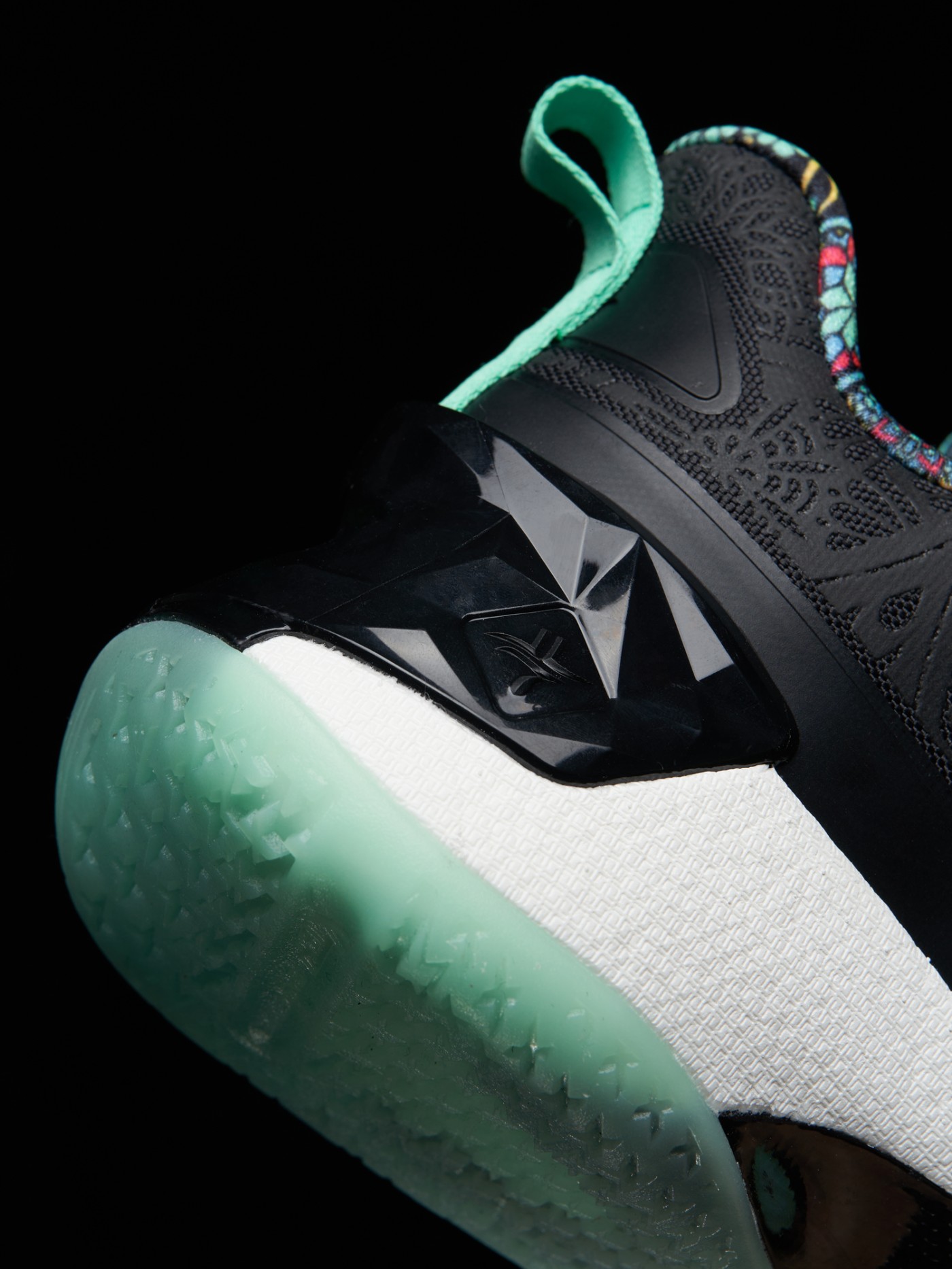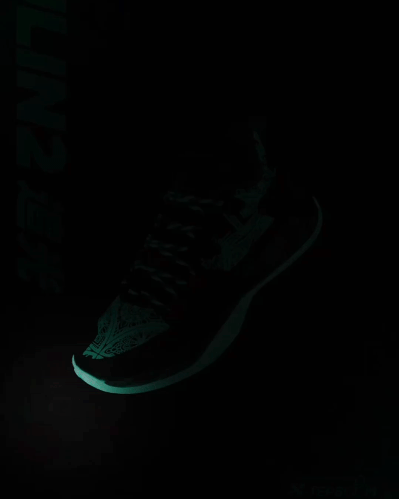 最大的亮点是鞋身暗藏的夜光效果,在暗处就能看到鞋面的立体暗纹呈现出绿色图案。