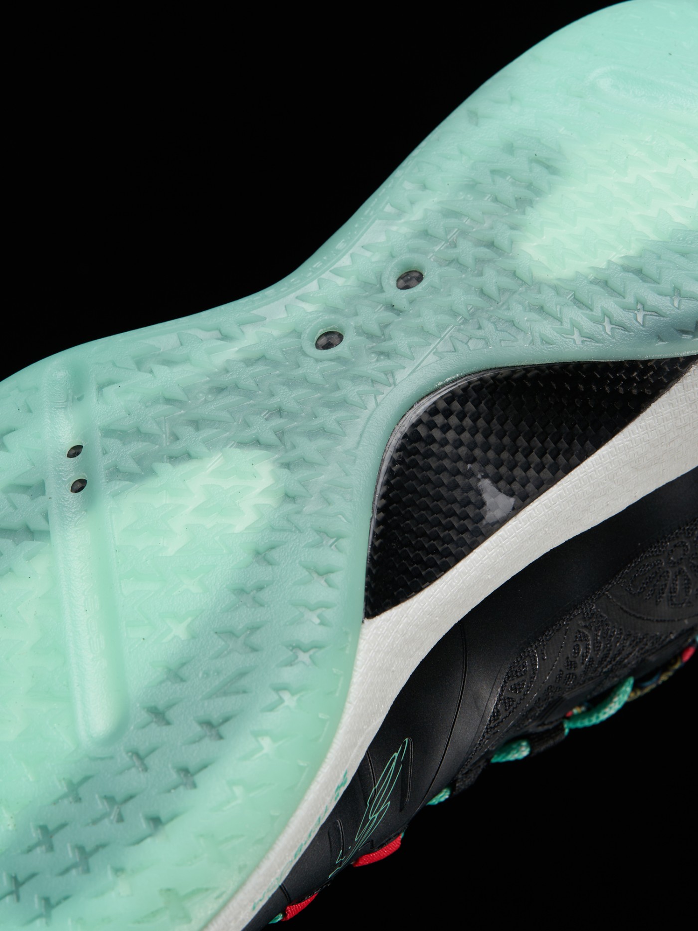 科技方面,中底搭载了全掌 X-TEPBOOM 缓震,并且能够看到几乎覆盖全掌的 X 形碳板,配置可谓豪华。