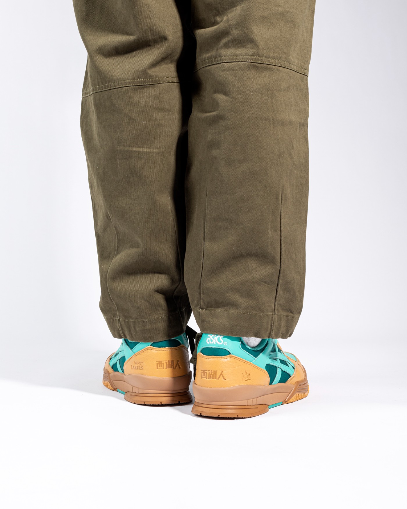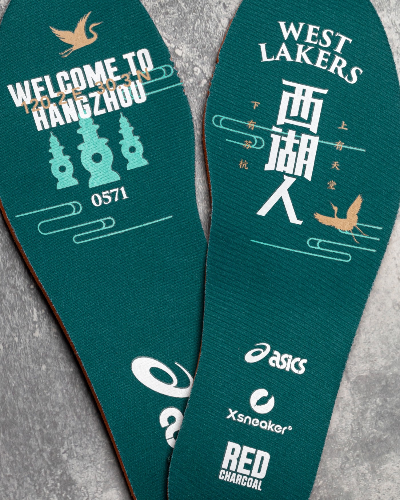 右脚鞋垫上则是这次配色的名称「西湖人」和「West Lakers」字样,还有著名诗句 “上有天堂,下有苏杭”,后掌部位还有此次三方联名,ASICS、Xsneaker 以及 Red Charcoal 的 Logo。