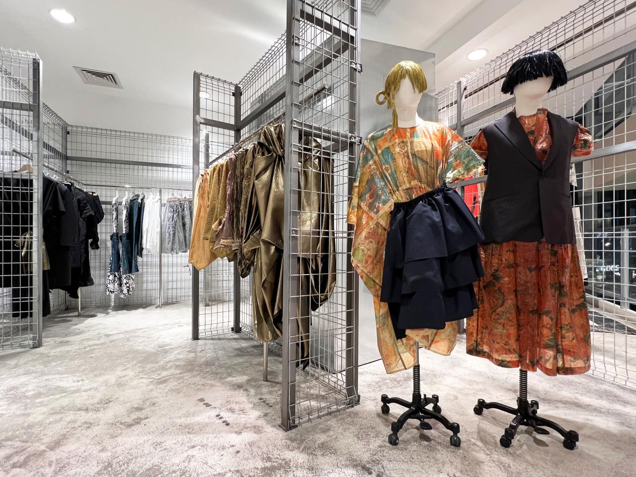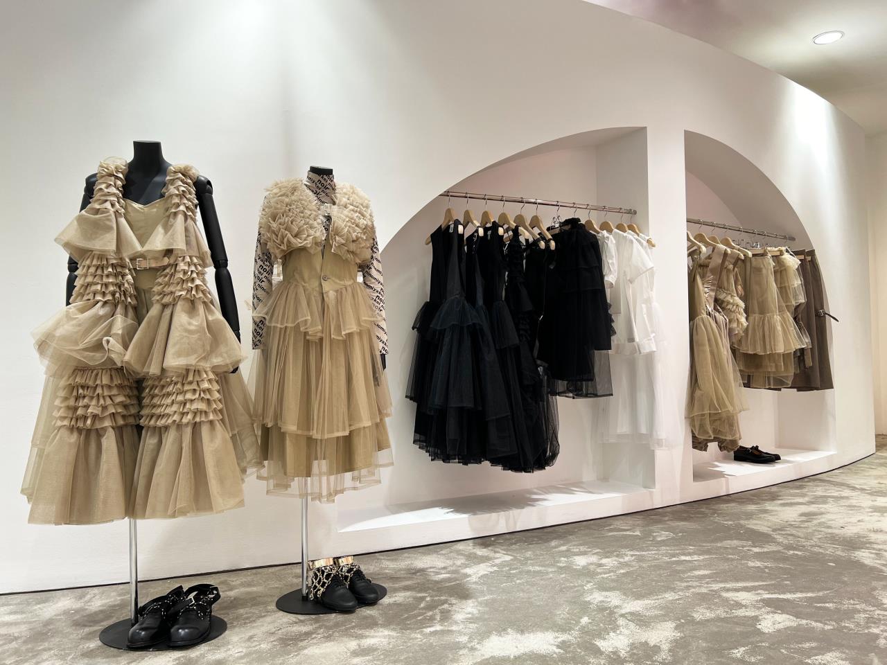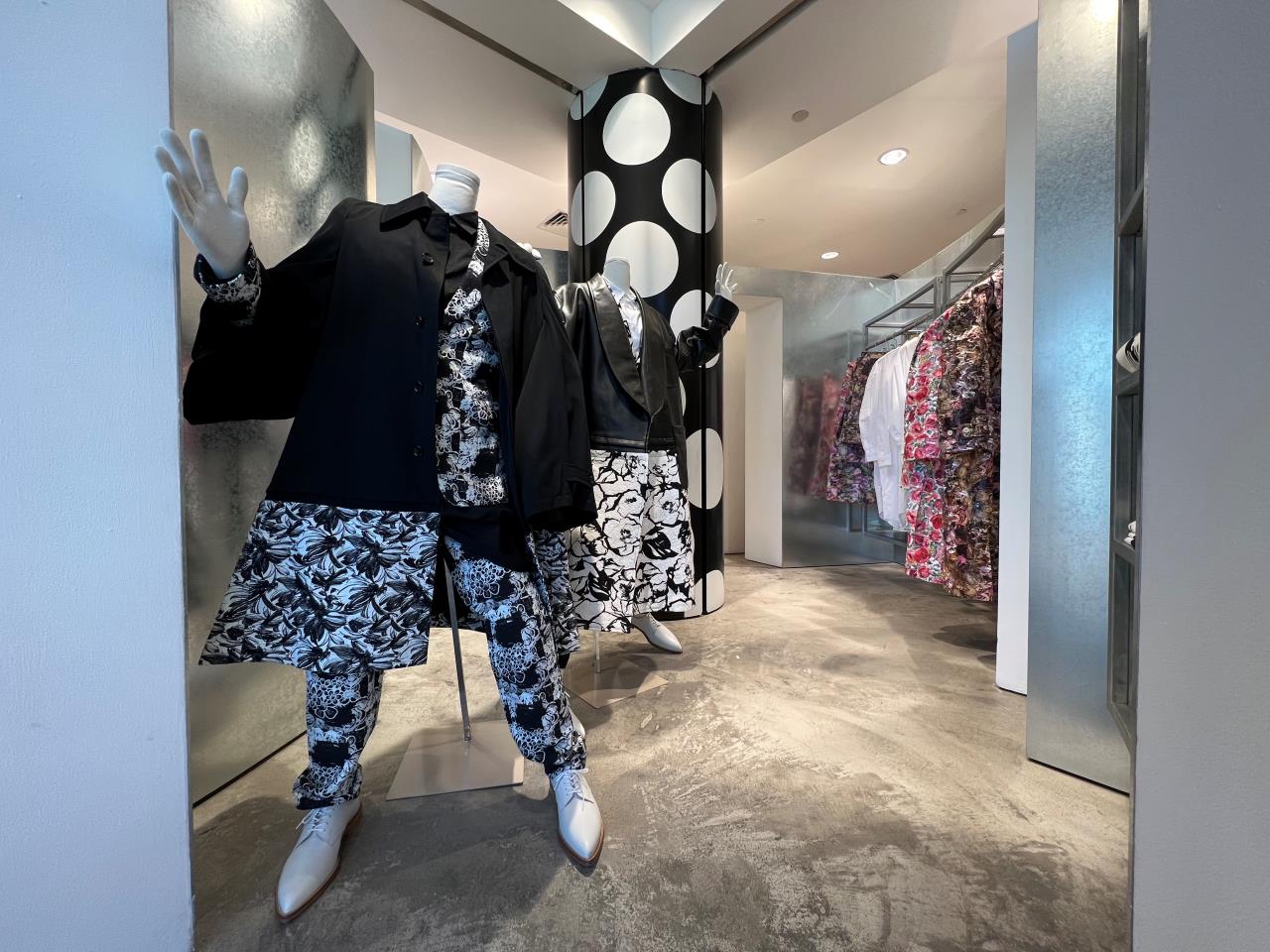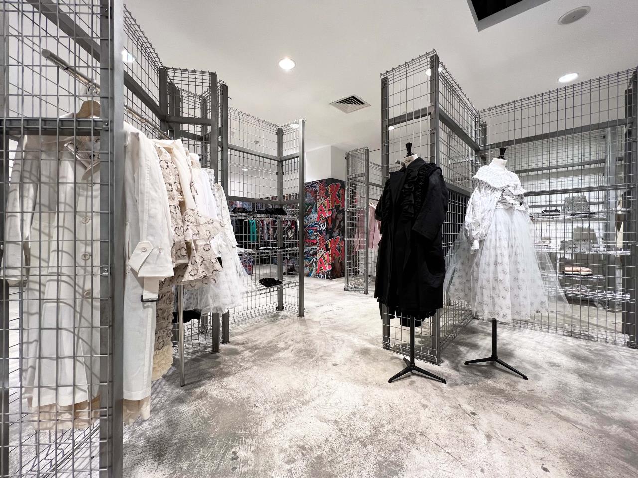 一层正门 COMME des GARÇONS 2022 春夏系列打造全新 ELEPHANT SPACE 装置。巨大廓形布满花朵、叶片和丝带图案,延续 CdG 以往的风格,搭配由 Gary Card 制作的拼贴塑料卡通少女假发,呈现出与众不同的反乌托邦风格。