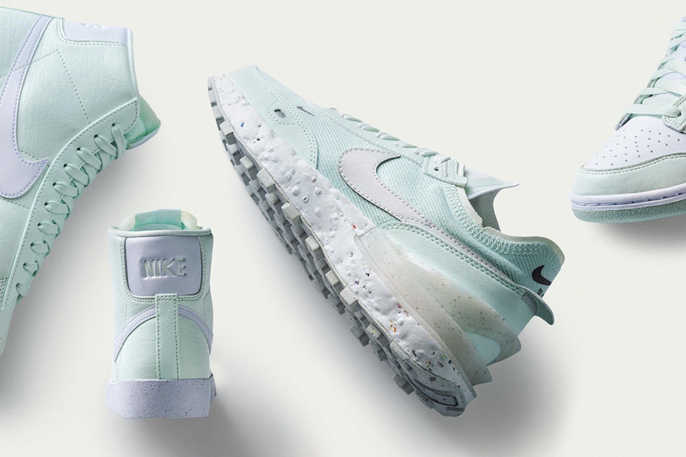 Waffle One、Blazer 和 Dunk 除了采用可回收皮革与可回收聚酯等材料外,还加入品牌独特 Nike Grind 橡胶。