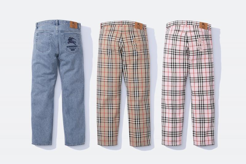 其中 Supreme 经典的 Box Logo 帽衫和 T 恤都加入 Burberry Nova Check 老花元素;Burberry 经典风衣背后的刺绣将骑士图案与 Supreme Logo 融合。