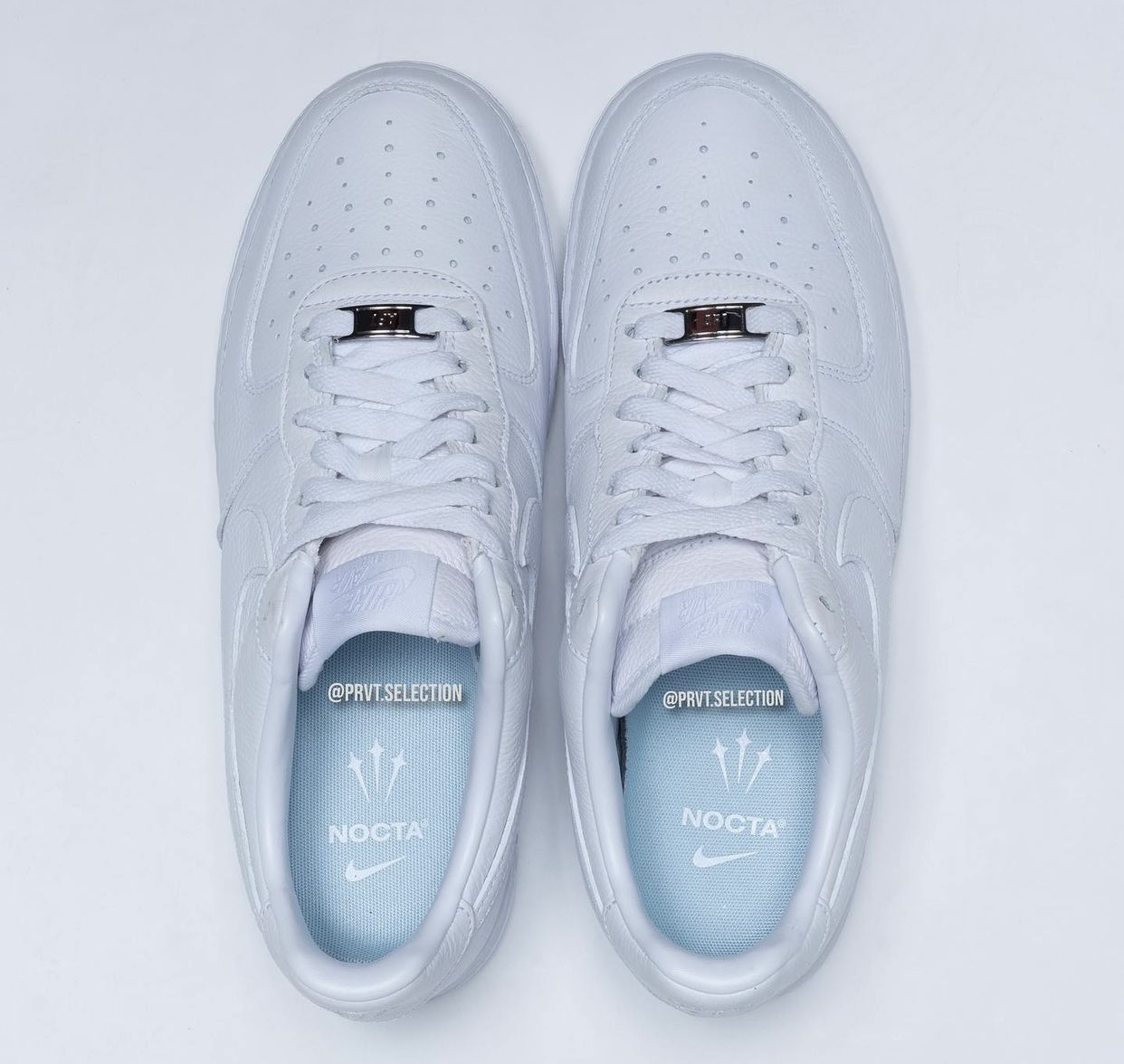 鞋垫是双方联名款惯用的浅蓝色,上面印有 “NOCTA” 和 Nike Swoosh,以及标志性的三剑 Logo。