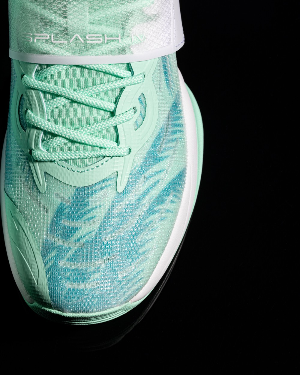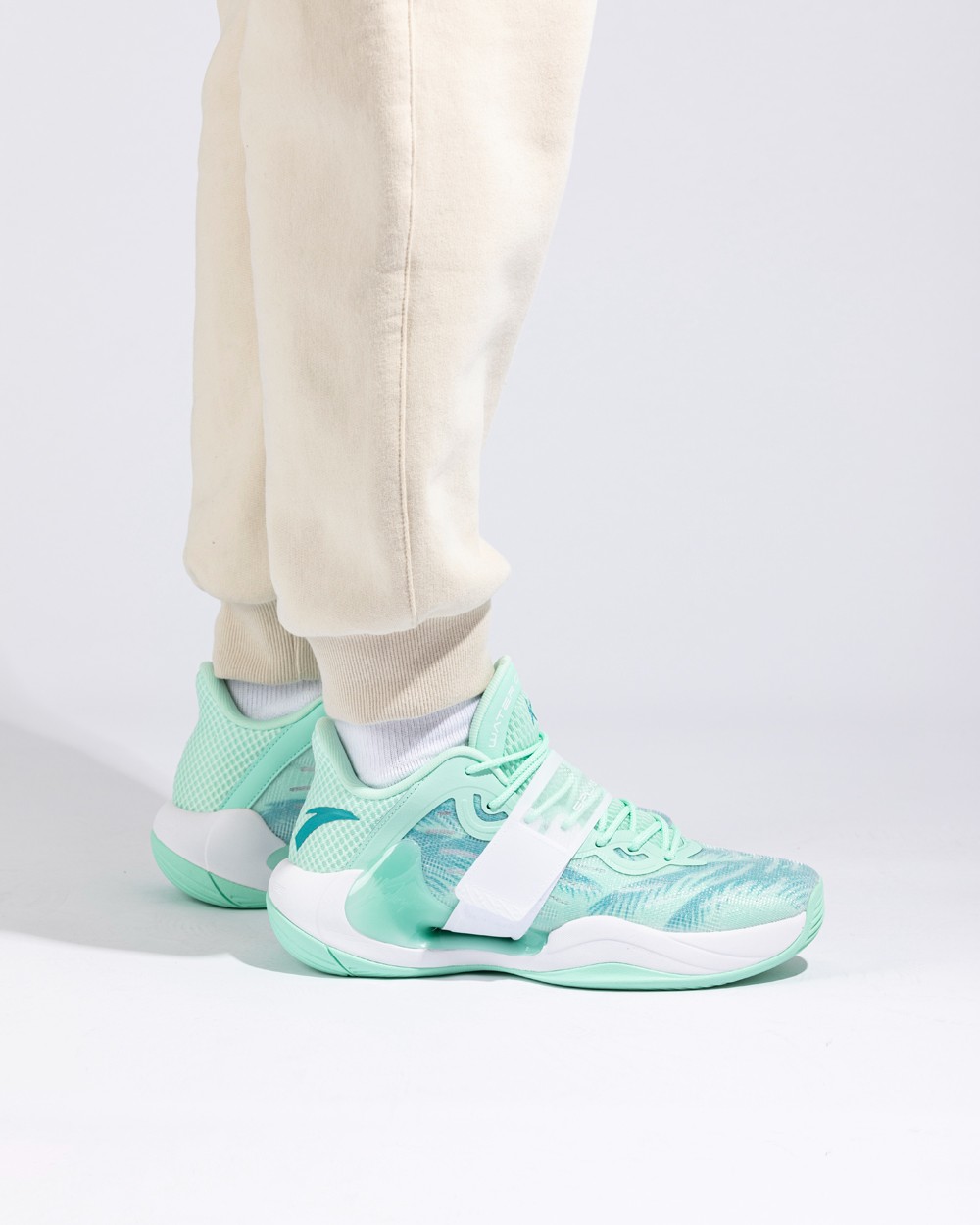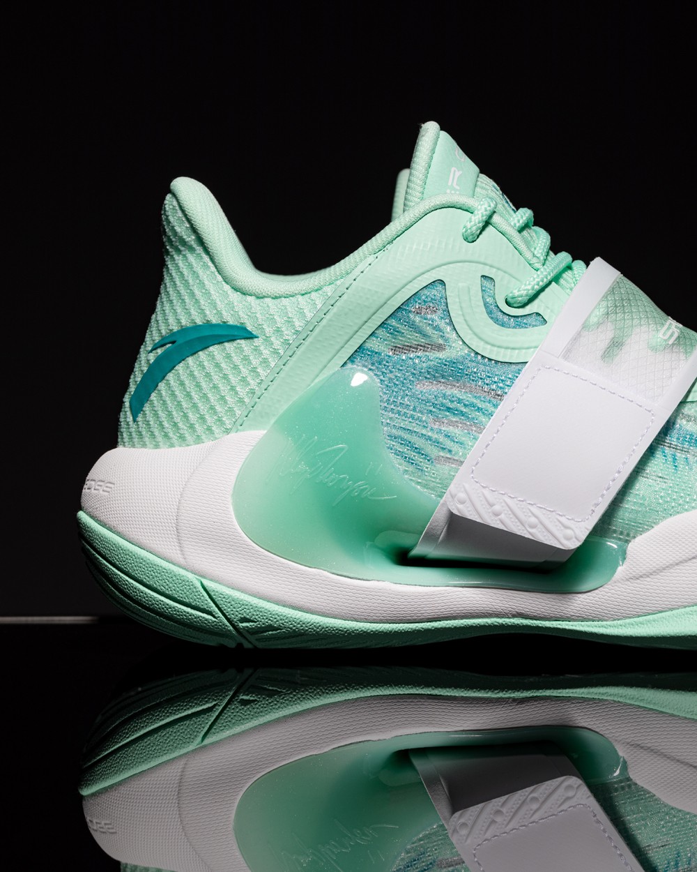 整双鞋以薄荷绿色呈现,高强度网纱鞋面兼顾实战与透气性,前掌内置安踏氮科技材料。