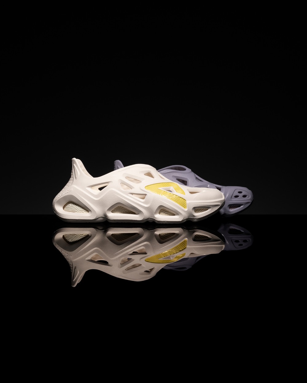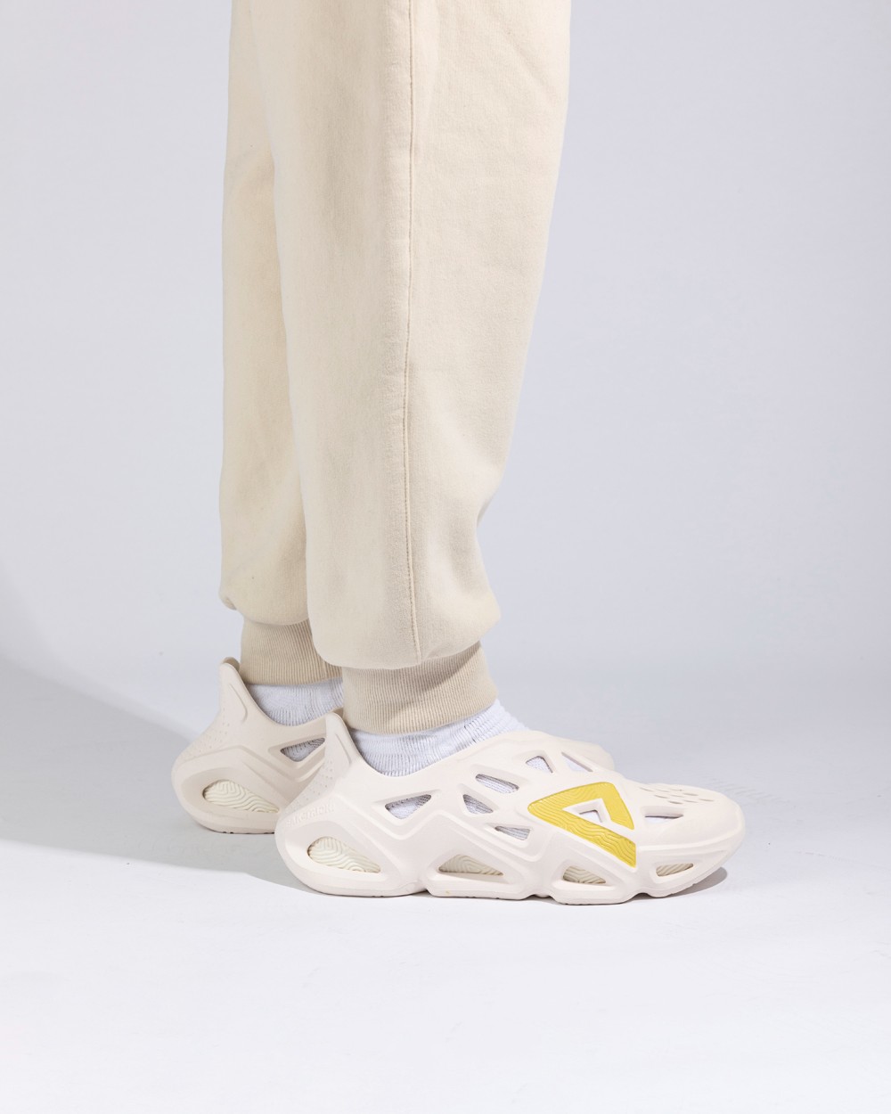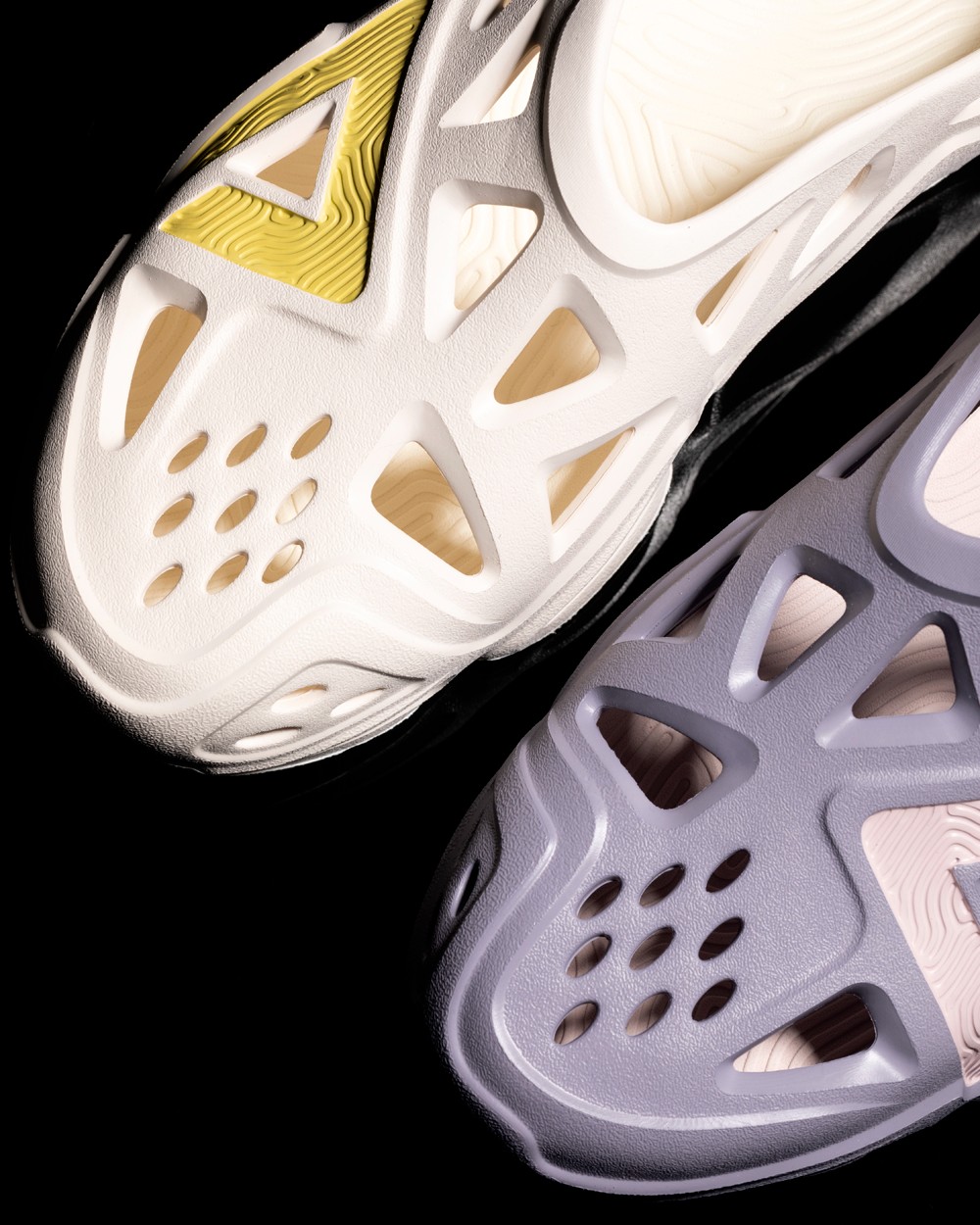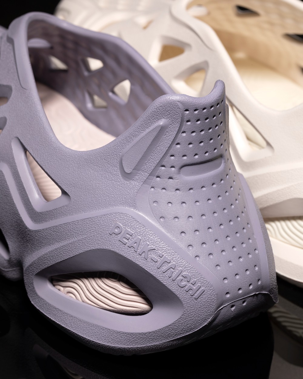 整双鞋以奶油色和浅紫色呈现,鞋身采用 EVA 材质的打造,三角形孔洞,十分适合夏季穿着。