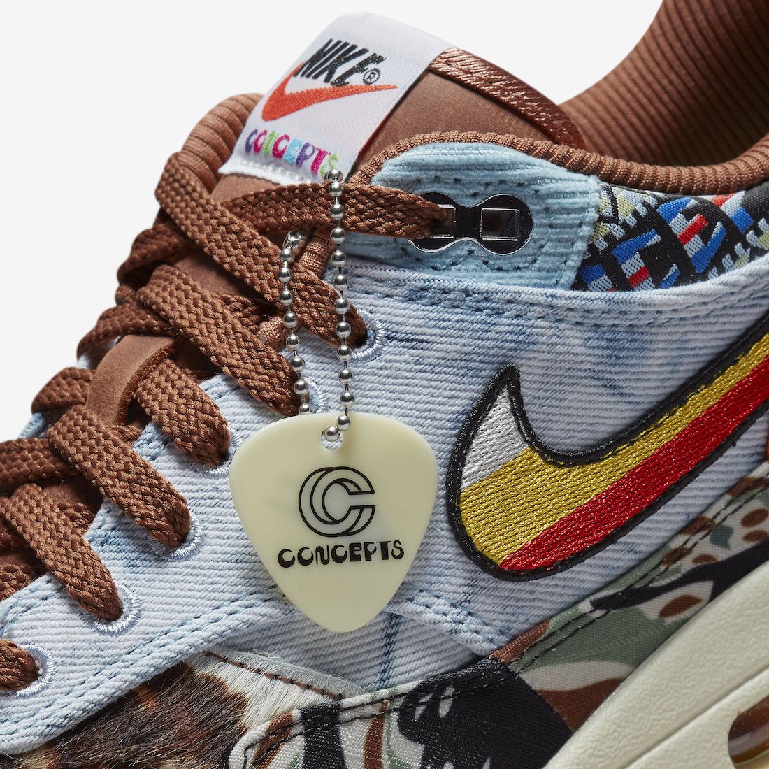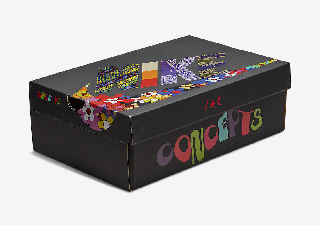 除此之外,鞋盒采用对应的花纹与装饰元素重塑,随鞋还附赠 Concepts 吊牌和额外配色鞋带,进一步完善音乐节的独特主题。