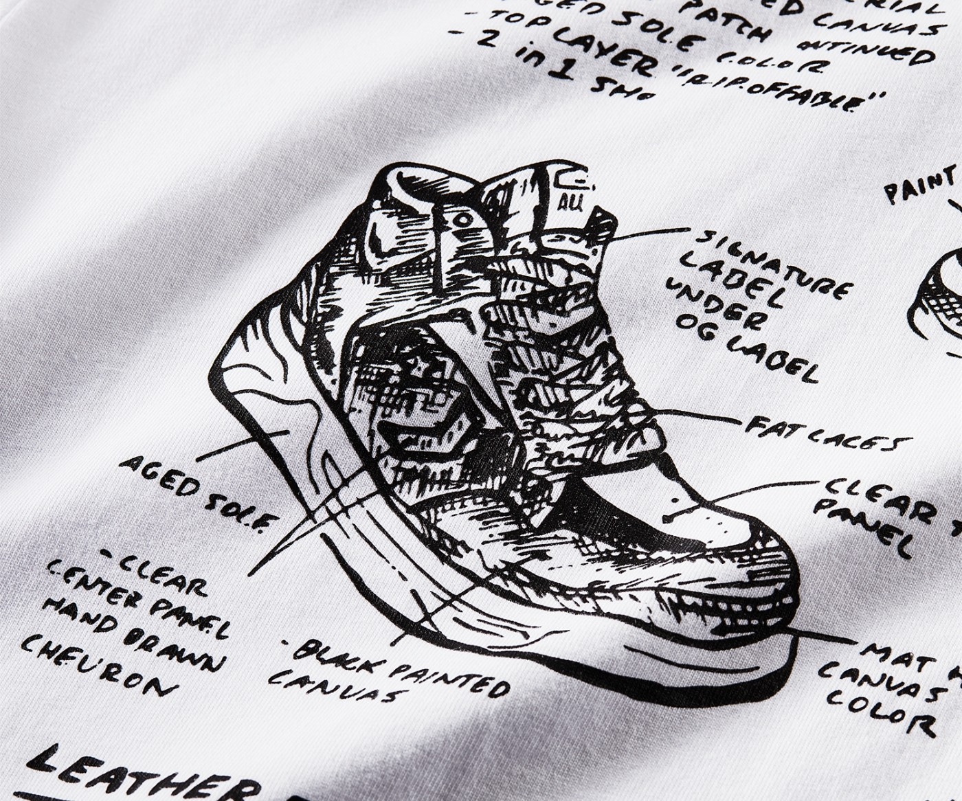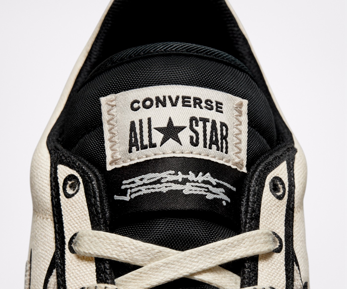 鞋头部分黑色织物延伸至鞋舌,鞋舌顶端同样有手绘字母印刷,彰显球鞋联名身份。