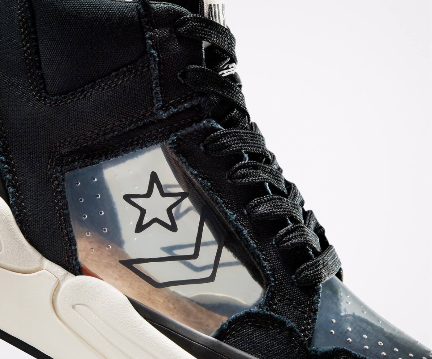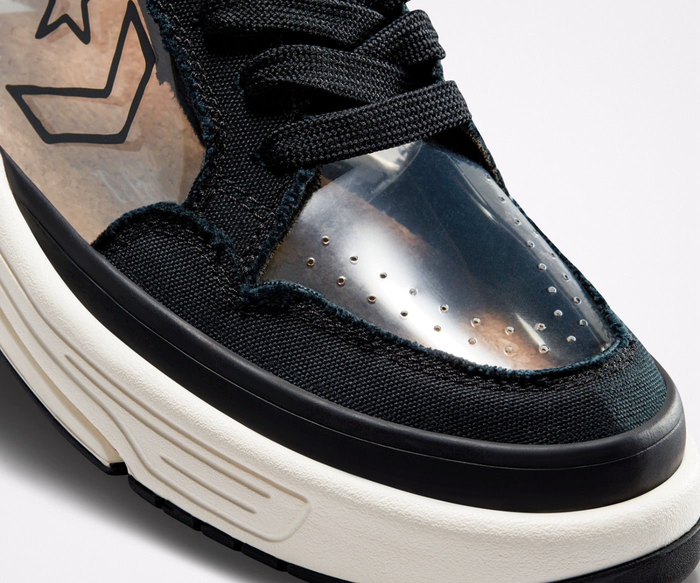 Weapon CX 一改传统织物和网布材质鞋面,在脚趾部分和鞋身中段换成透明的塑料材质,带来更多的玩法和搭配可能性。