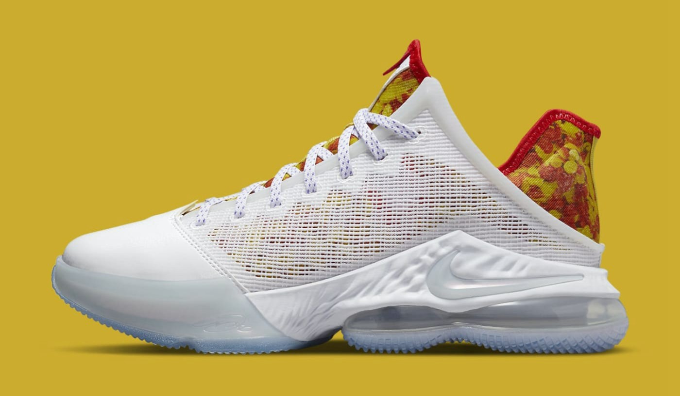 首先要登场的就是 LeBron 19 Low,整体配色延续了「水果麦片」的风格,使用大面积白色搭配麦片图案。