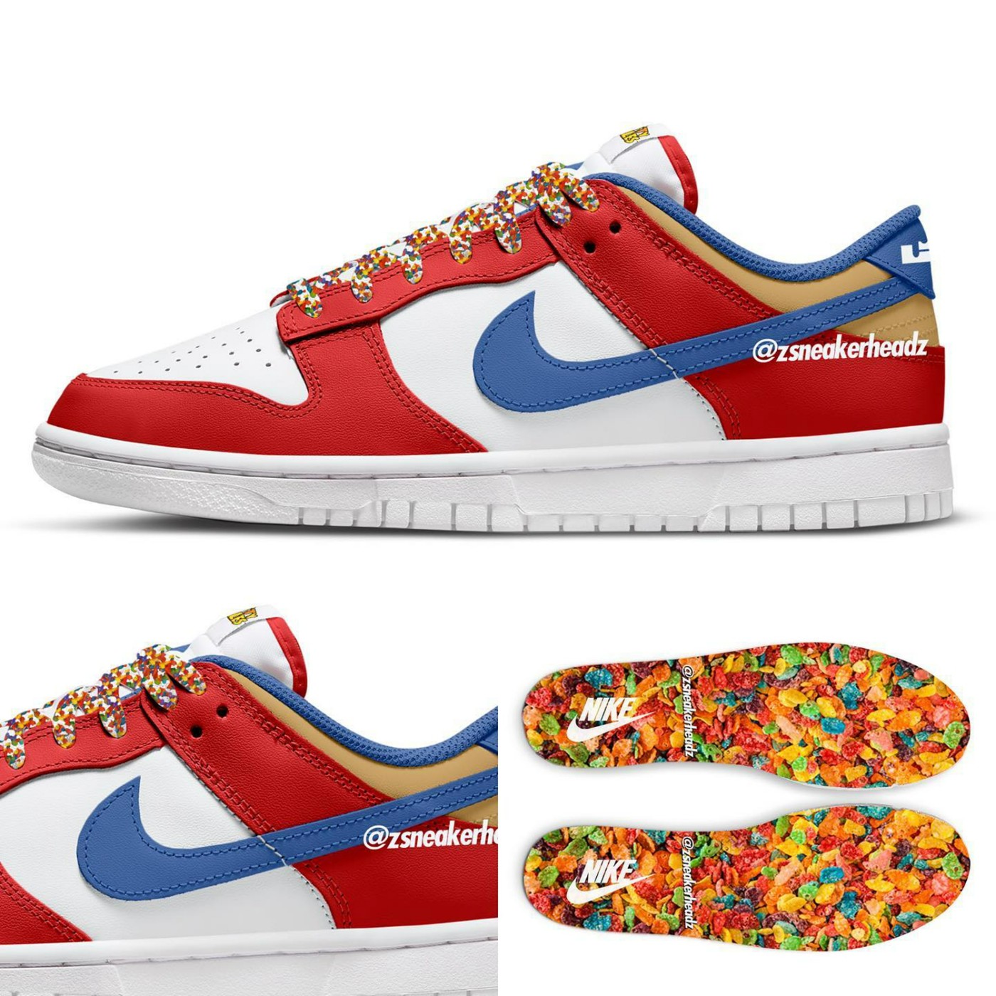 红色鞋身框架以及蓝色 Swoosh 都给人一种眼前一亮的感觉,鞋垫上满印的麦片图案让人垂涎欲滴。