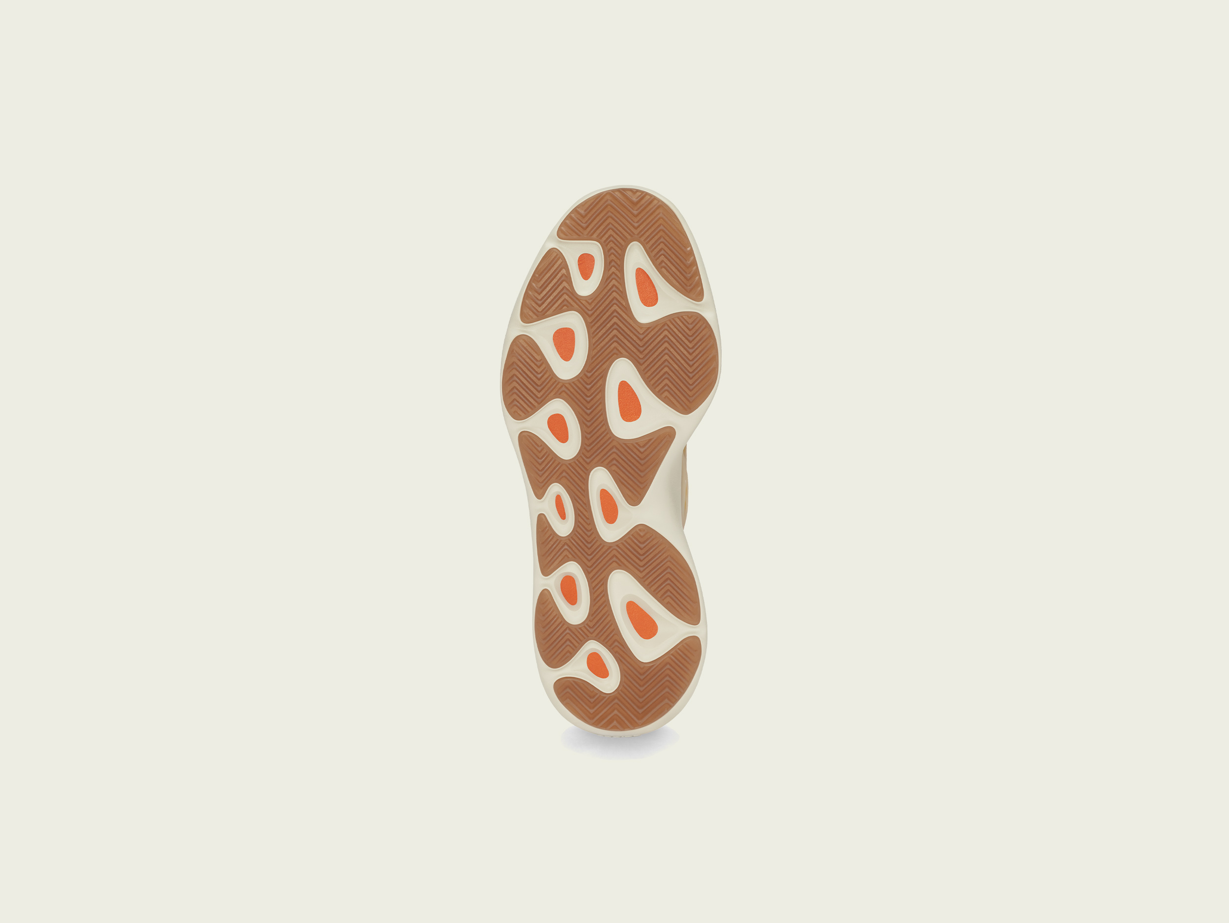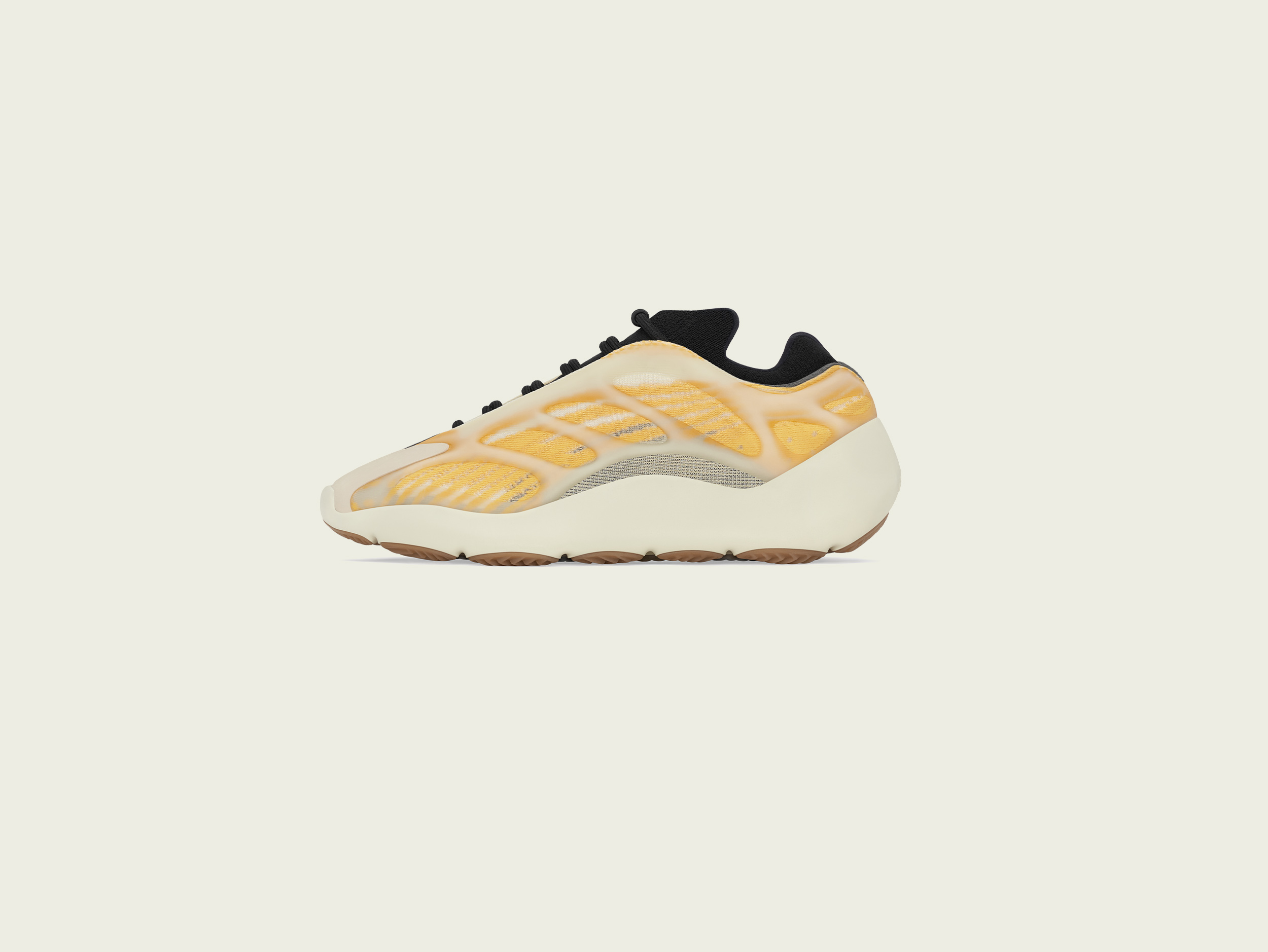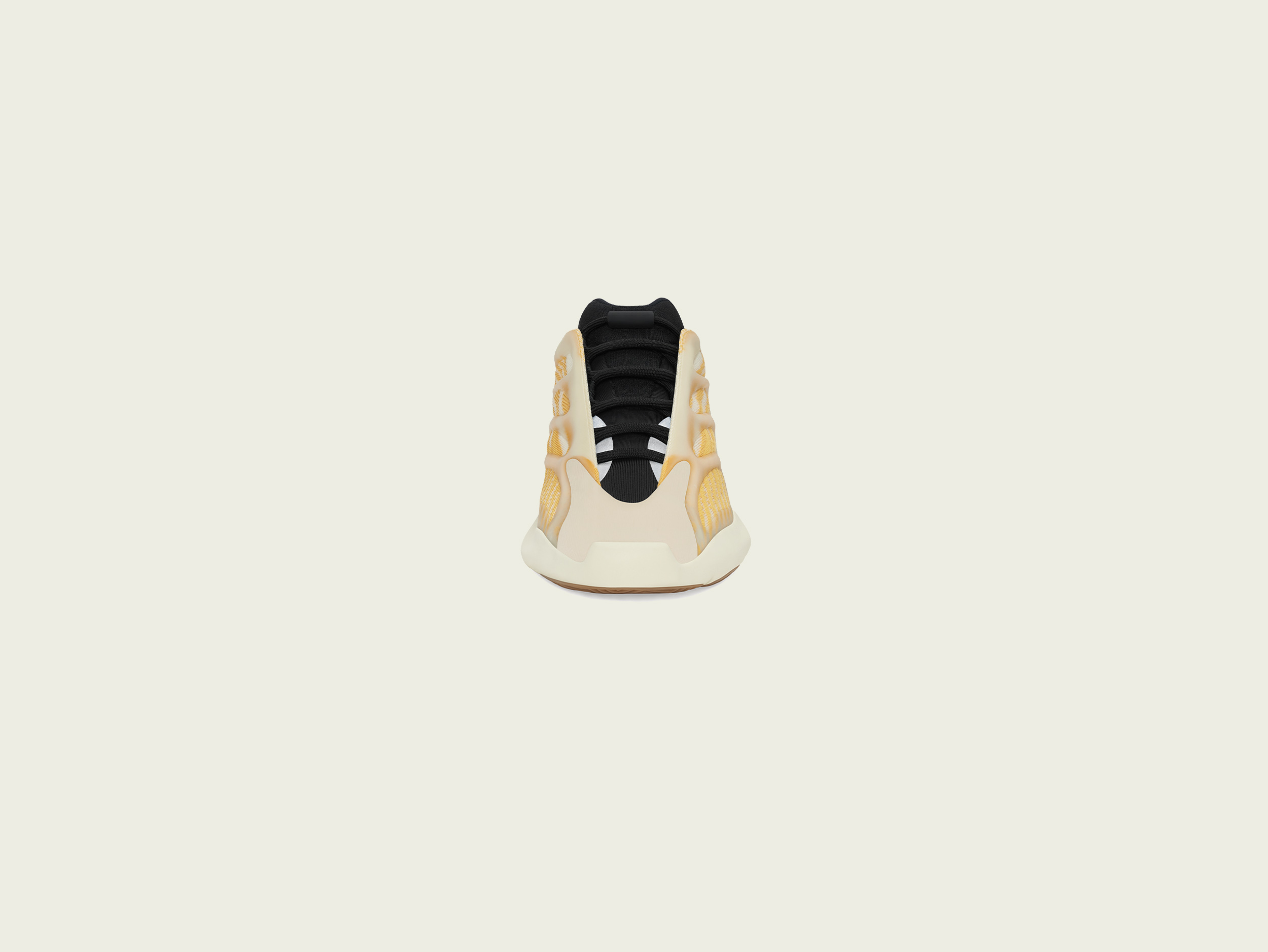 整双鞋以淡黄色搭配乳白色为主调,非常适合春夏季穿着,同时鞋身框架为夜光材质,暗处会变成亮眼的橙色,视觉效果格外独特。