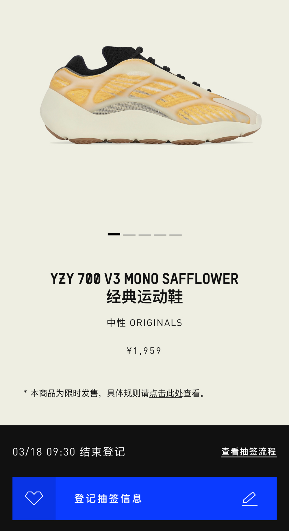 上周末刚发了黑白油漆条 Yeezy Boost 350 V2,月底还有一双纯白侧透 Yeezy Boost 350 V2,本周则将迎来一双红花 Yeezy 700 V3 “Mono Safflower”,今天刚刚开始登记。