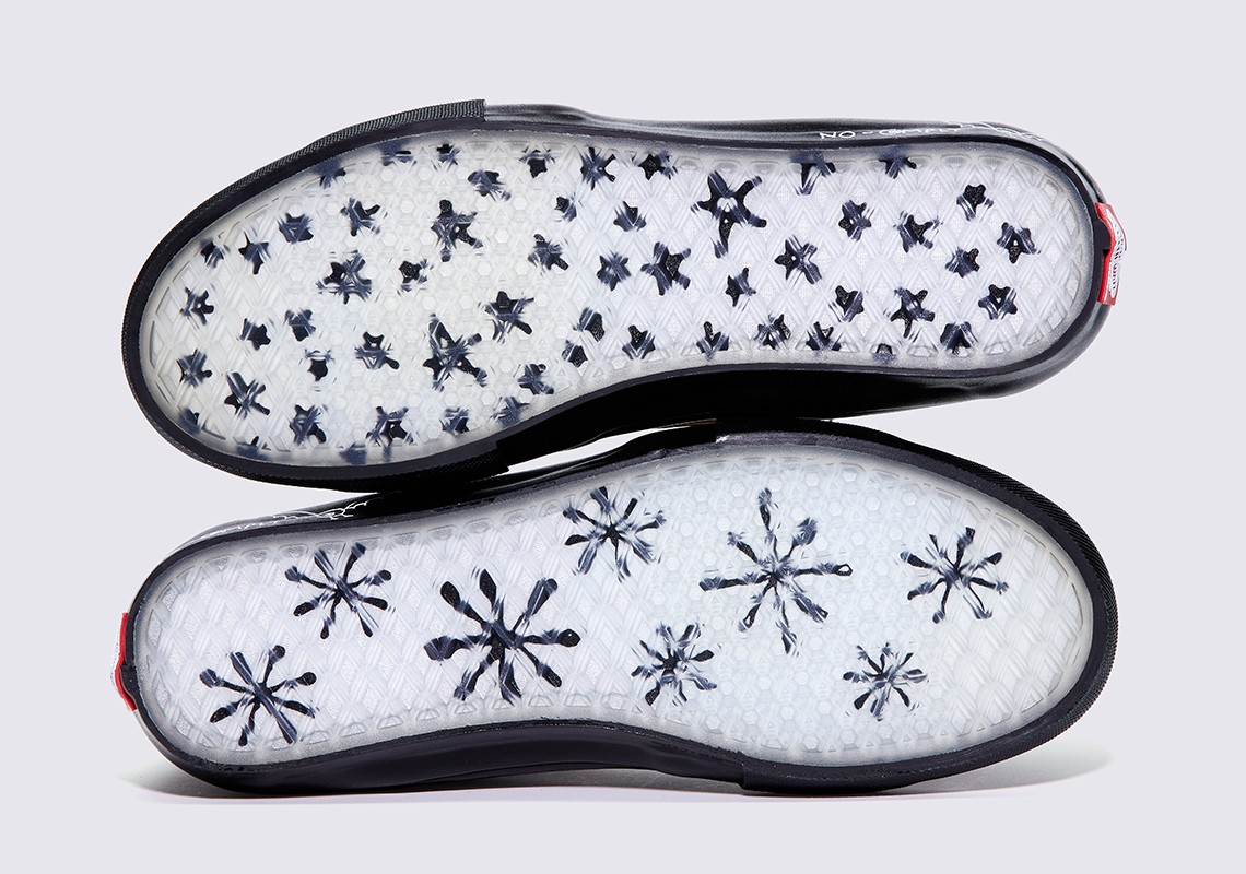 两双滑板鞋分别以黑白色主基调示人,辅以标志性透明水晶底收尾,尽显简约的配色设计。