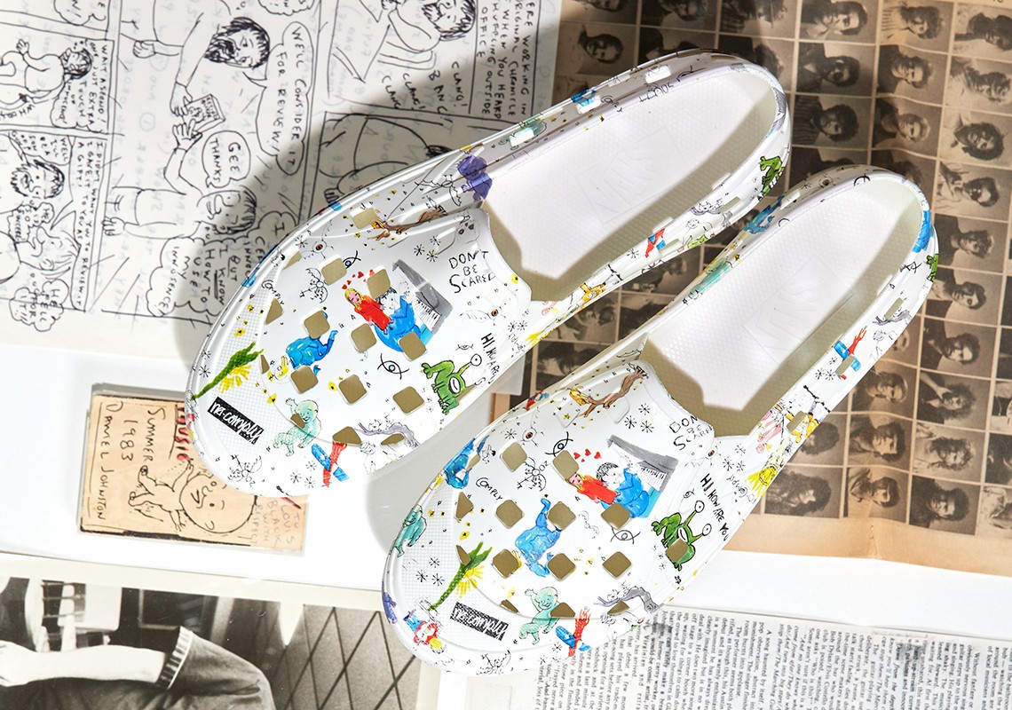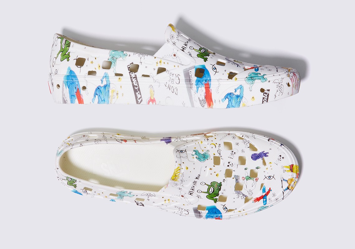 Trek 拖鞋系列由白色塑胶材料一体成型制作而成,鞋面满印标志性卡通涂鸦图案。