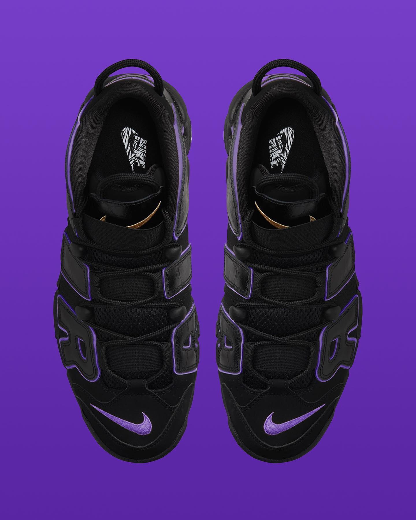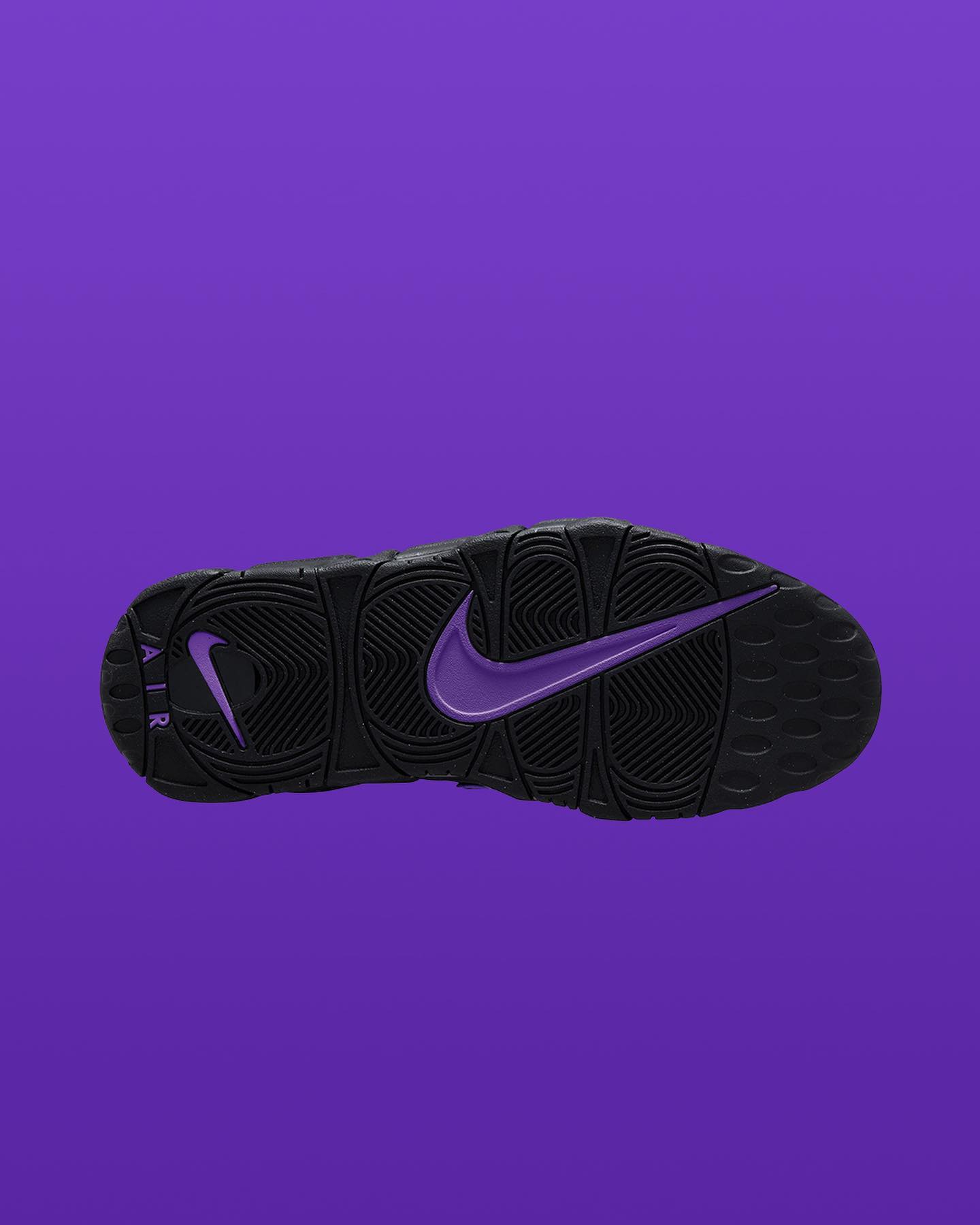 鞋身侧面黑色光面皮打造的 AIR 有紫色留边,搭配鞋舌黄色 Swoosh,构成湖人经典配色方案。