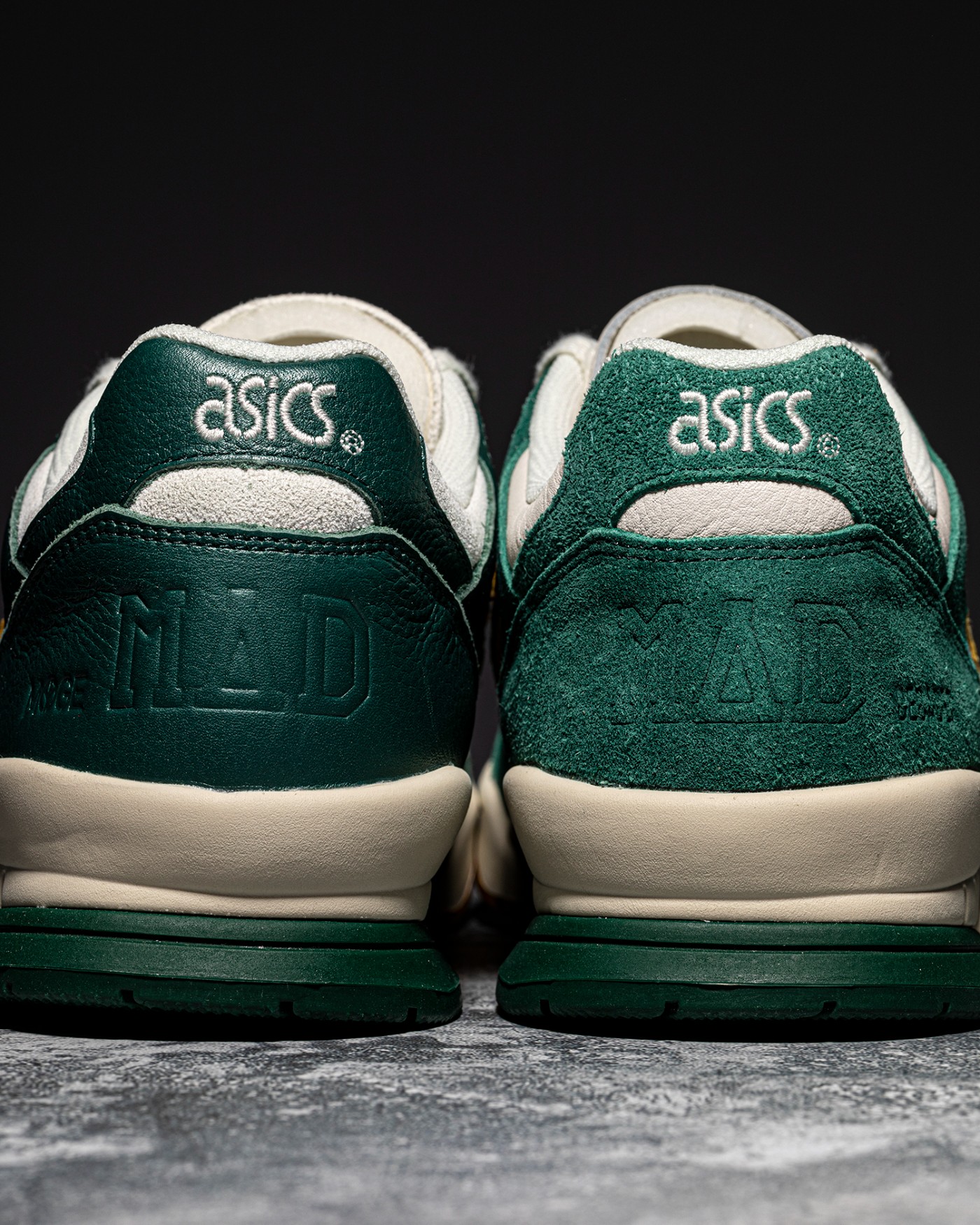 后跟方面分别印有 DECADES、MYGE 以及 MAD 压花图案,与上方 ASICS LOGO 相呼应,为整双鞋赋予北京街头文化色彩。