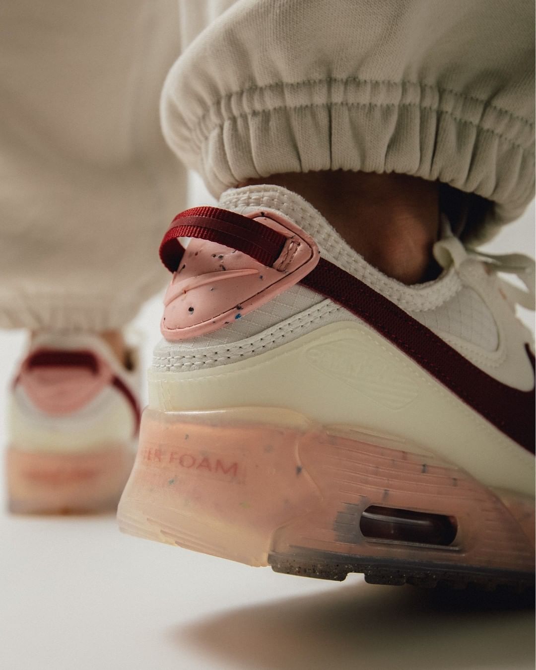 另一双侧面换用暗红色 Swoosh 和粉色中底,整体配色方案也相当和谐统一。
