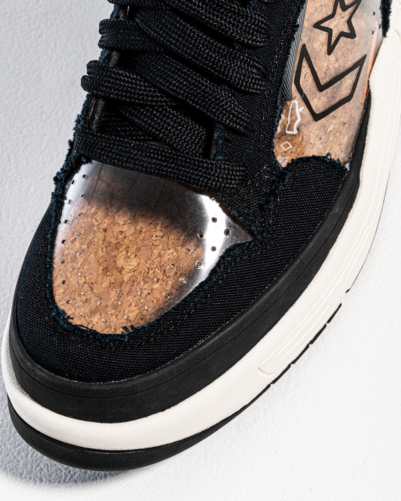 透过透明鞋面,可以看到满印软木塞图案的鞋垫。