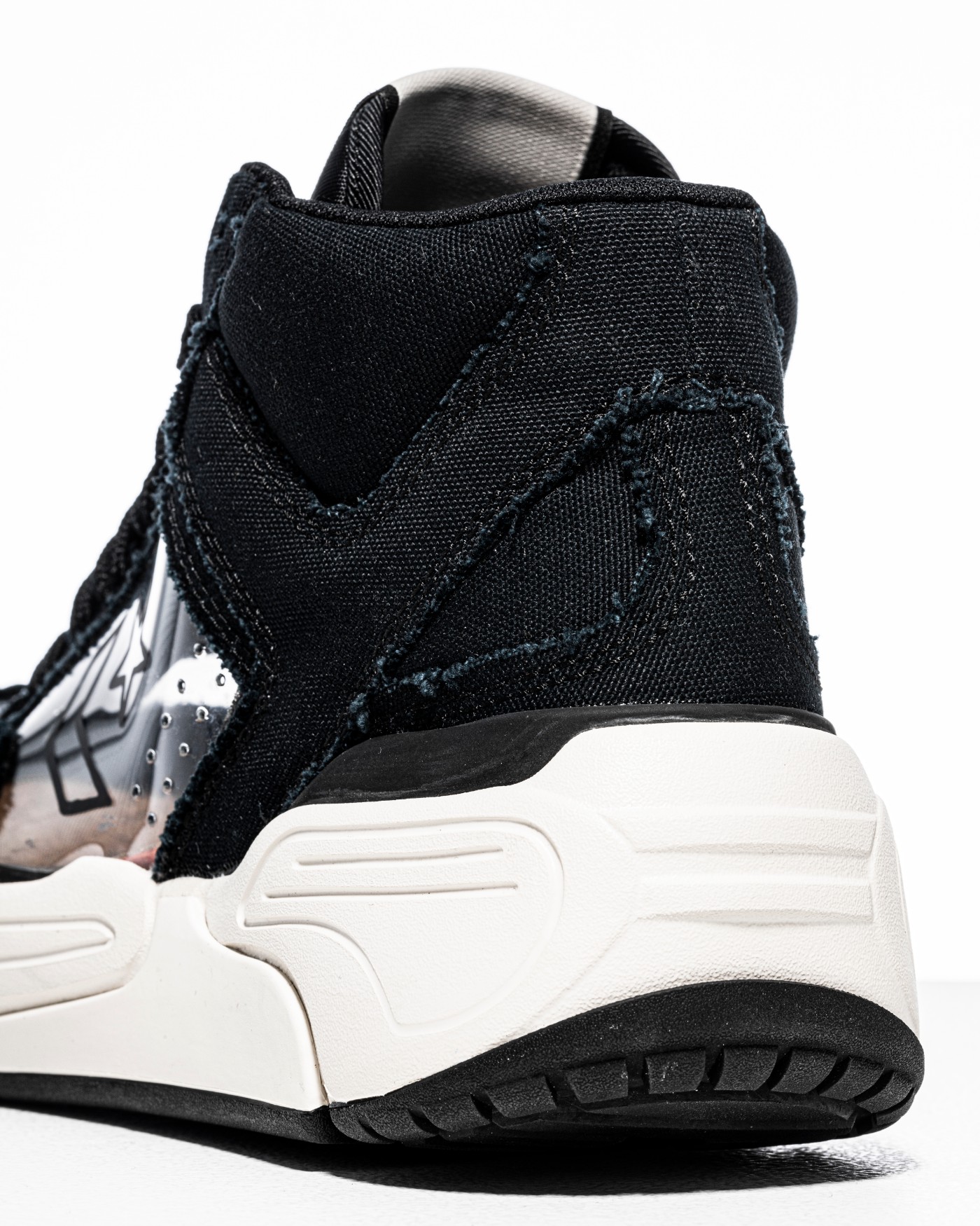 黑色帆布鞋身框架采用粗糙的藏青色毛边设计,带来纯手工制作的观感,体现 Joshua Vides 的独特美学。