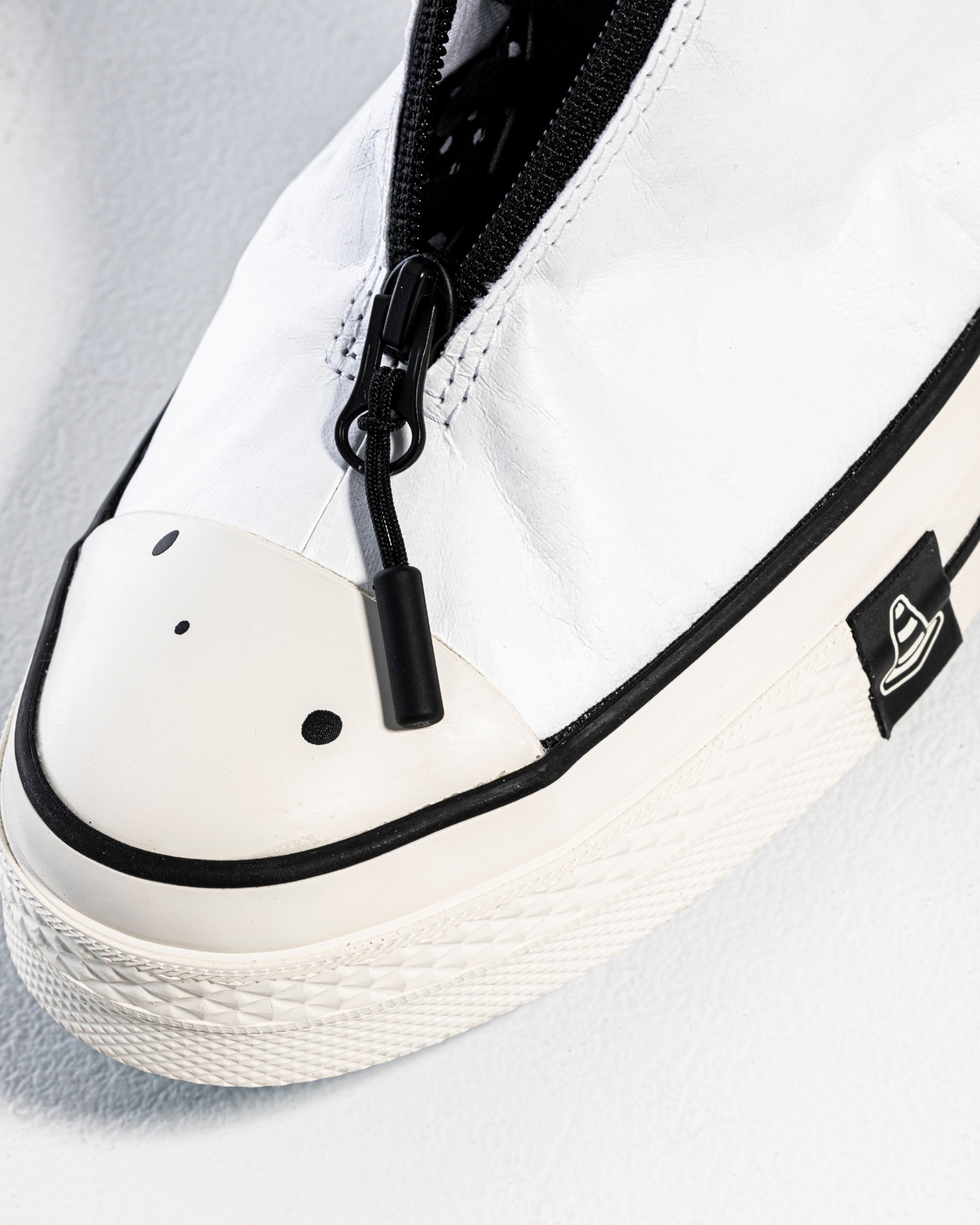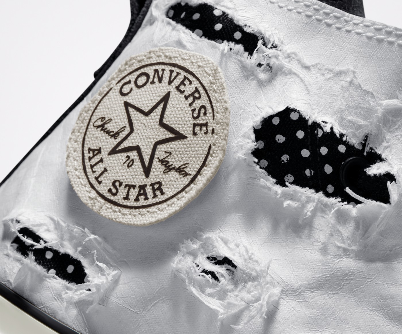 Chuck 70 鞋款暗藏撕撕乐属性,最外层是杜邦纸 Tyvek® 材料制成的拉链护罩,内侧是印有波点图案的帆布鞋面。