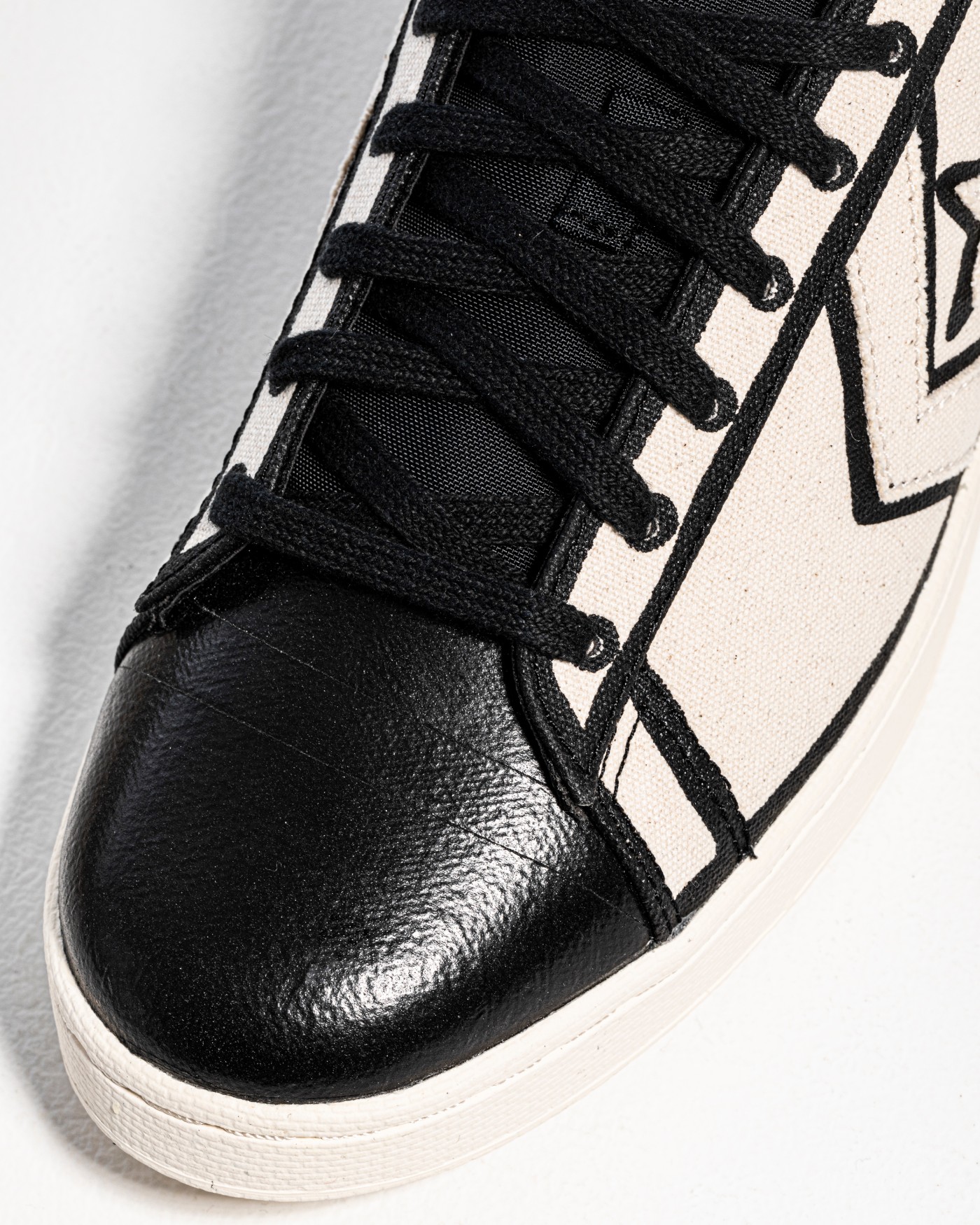 第三双 Pro Leather 选用轻微做旧的米白 + 黑配色方案,鞋头胶布质感的 TecTuff 涂层皮革处理,是整双鞋的独特亮点。