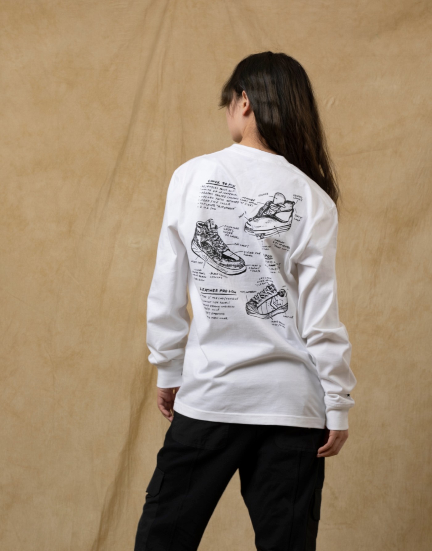 其中最具辨识度的当属白色长袖 T 恤了,以漫画手绘形式勾勒了本次三双联名鞋款的复杂细节,充满了 Joshua Vides 个人风格,突显联名身份。