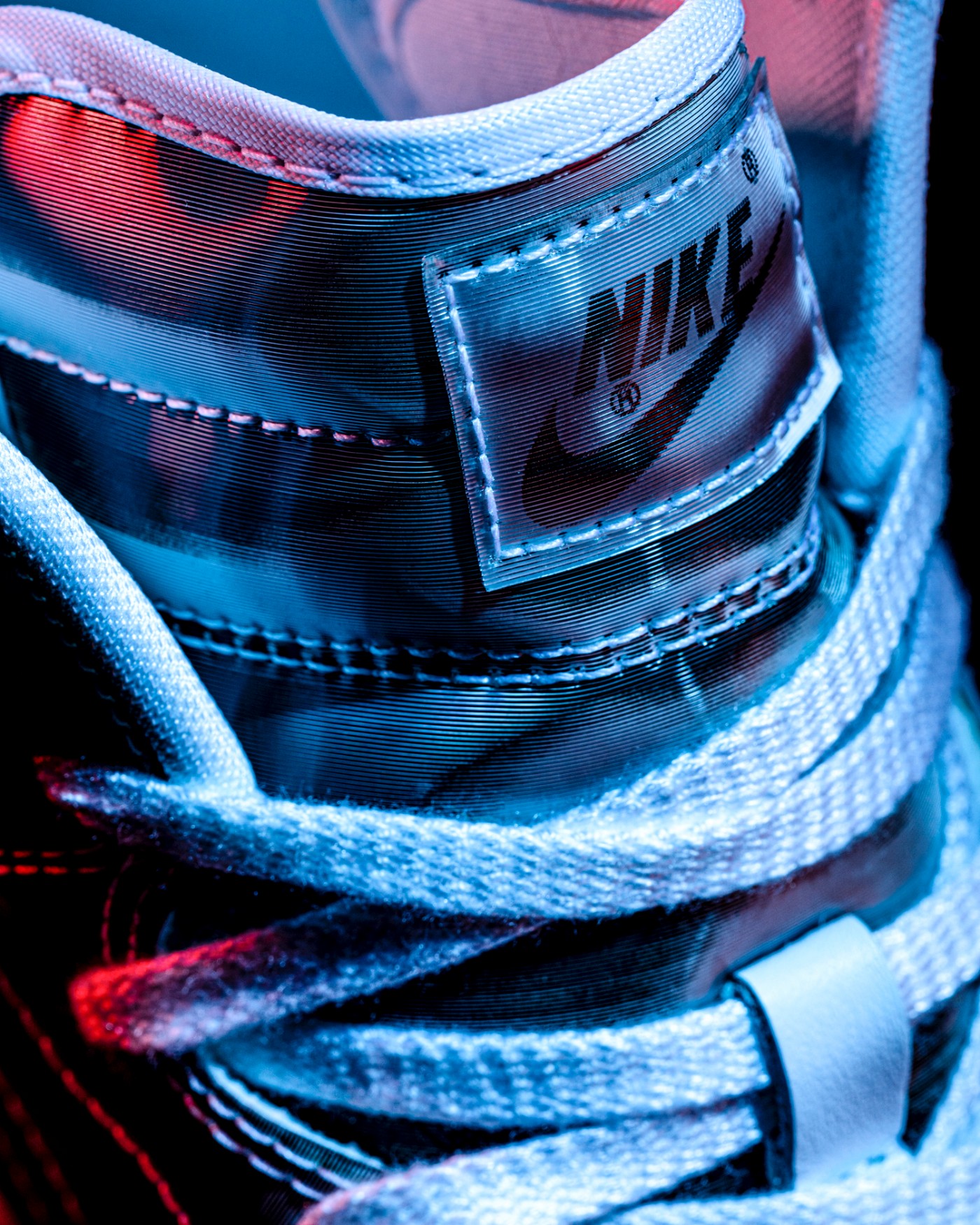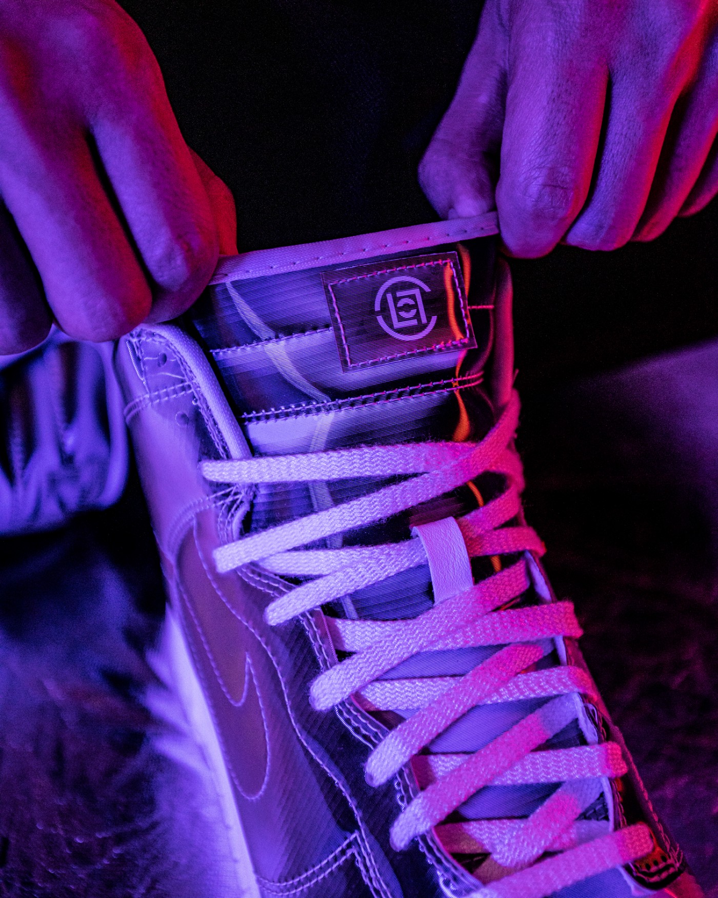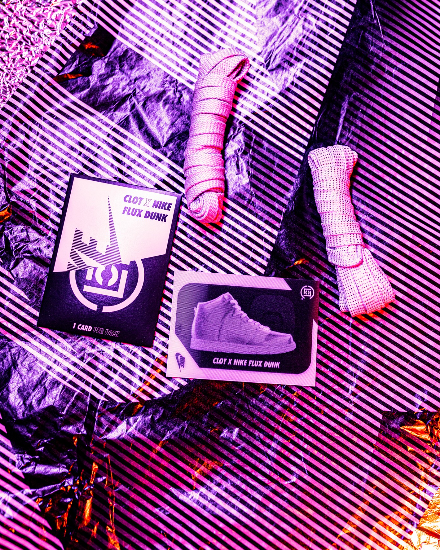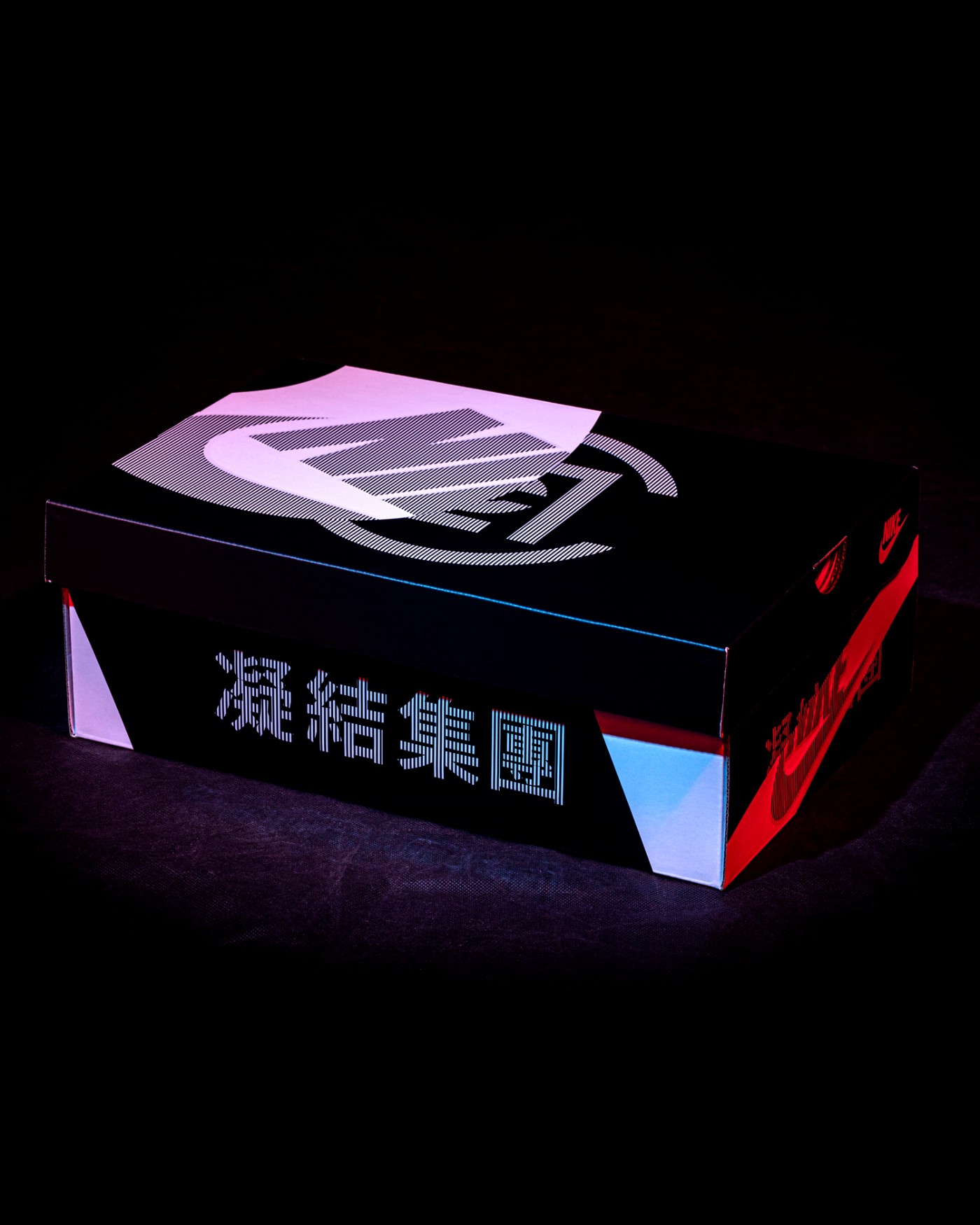 黑白撞色衬托下,凸显光栅纹理的 Nike、CLOT、凝结集团标志。