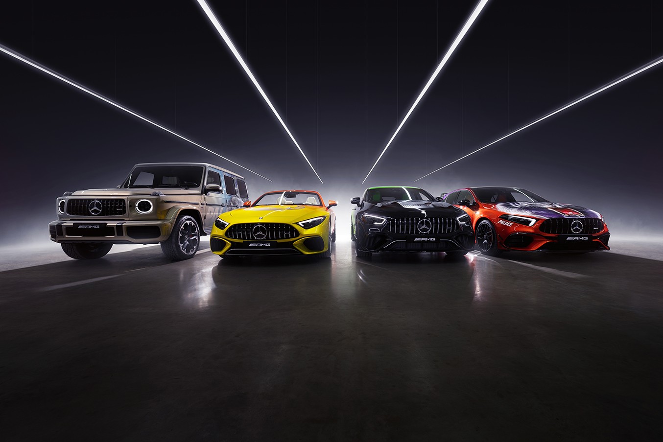 双方打造的四款车分别是 Mercedes-AMG A 45 S、Mercedes-AMG GT 63 4MATIC+、Mercedes-AMG SL 63 4MATIC+ 和 Mercedes-AMG G 63。