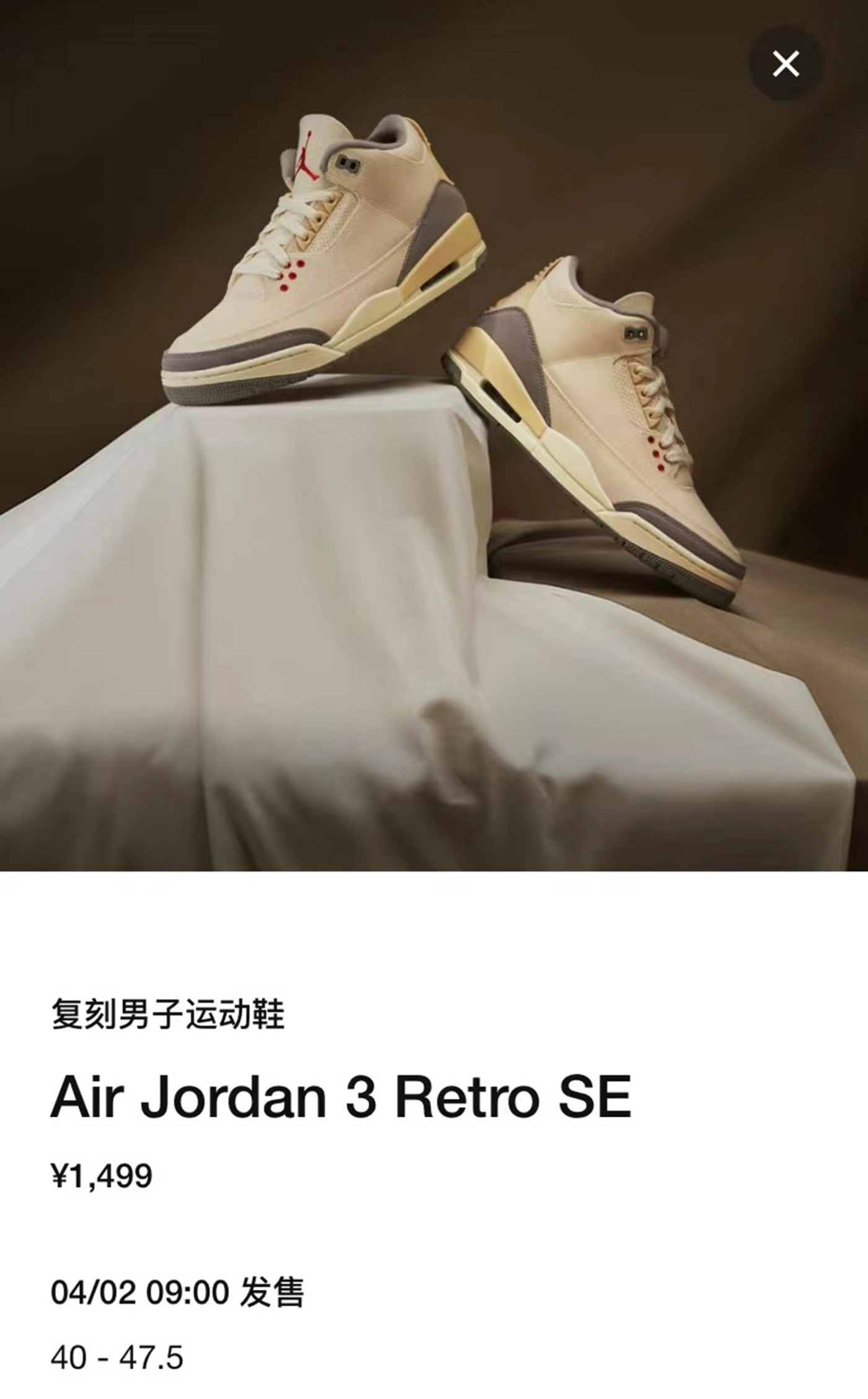 目前,全新 Air Jordan 3 “Muslin” 已经正式上架国区 SNKRS,并将于 4 月 2 日上午九点整发售,发售价格为 ¥1499 元。