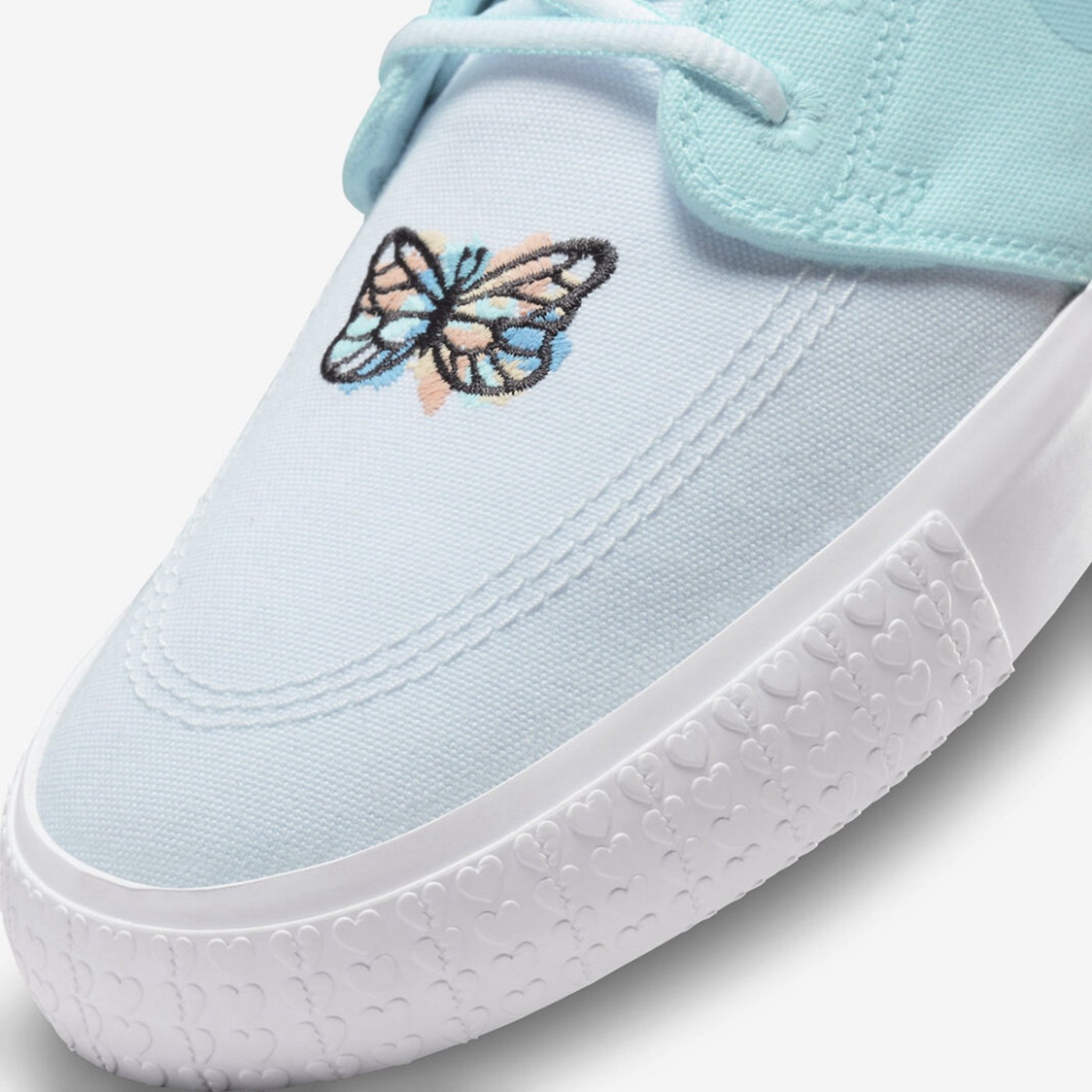 鞋头部分使用浅紫色织物,鞋带前端有蝴蝶图案刺绣,这个蝴蝶意味着 “蜕变”,表达她对病情好转寄予厚望。