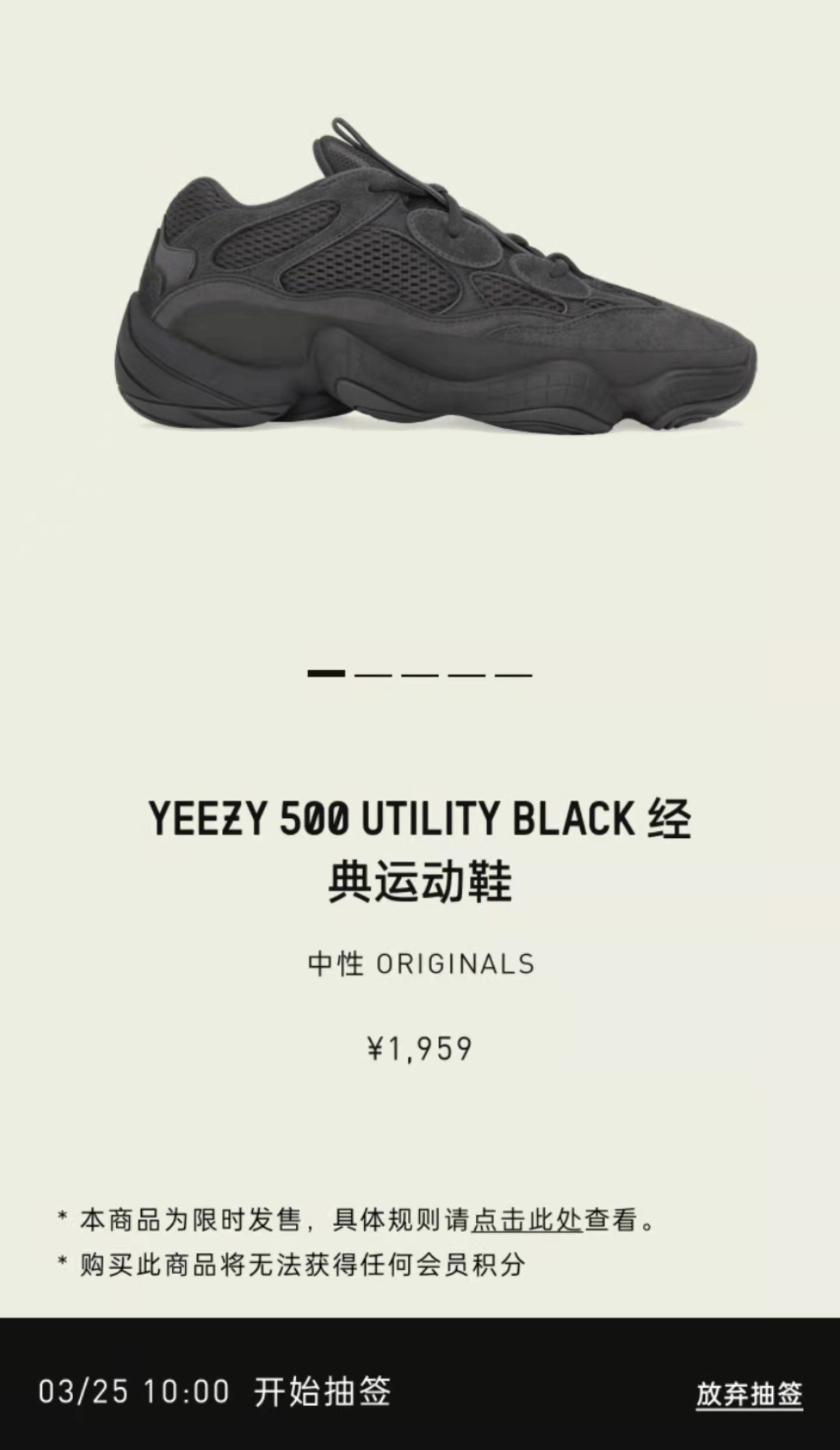 此次补货的 adidas Originals Yeezy 500 “Utility Black” 将于 3 月 25 日也就是明天发售,发售价 ¥1959 元。