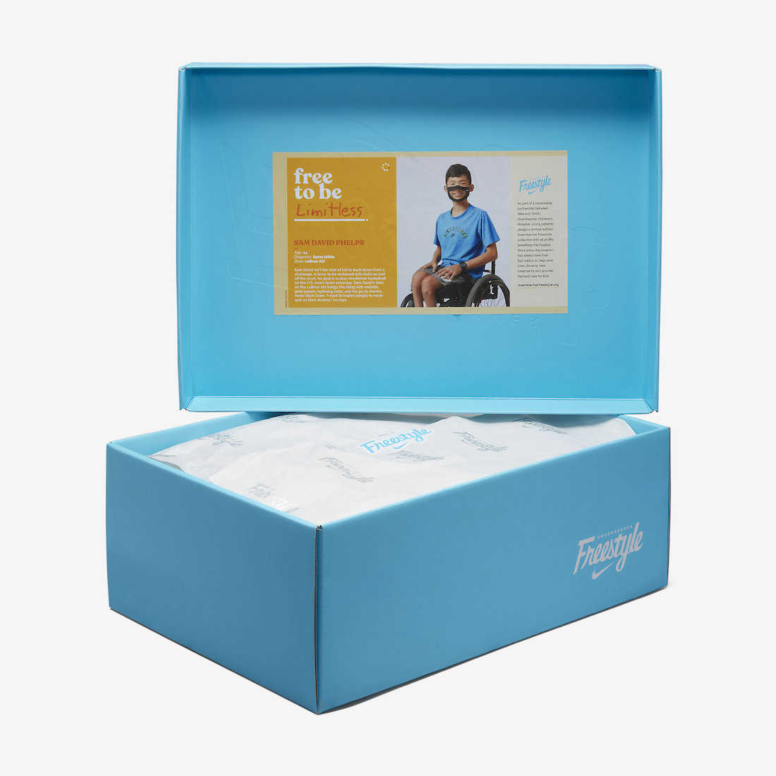 慈善系列专属的浅蓝色鞋盒内部,有 Sam 的个人故事。