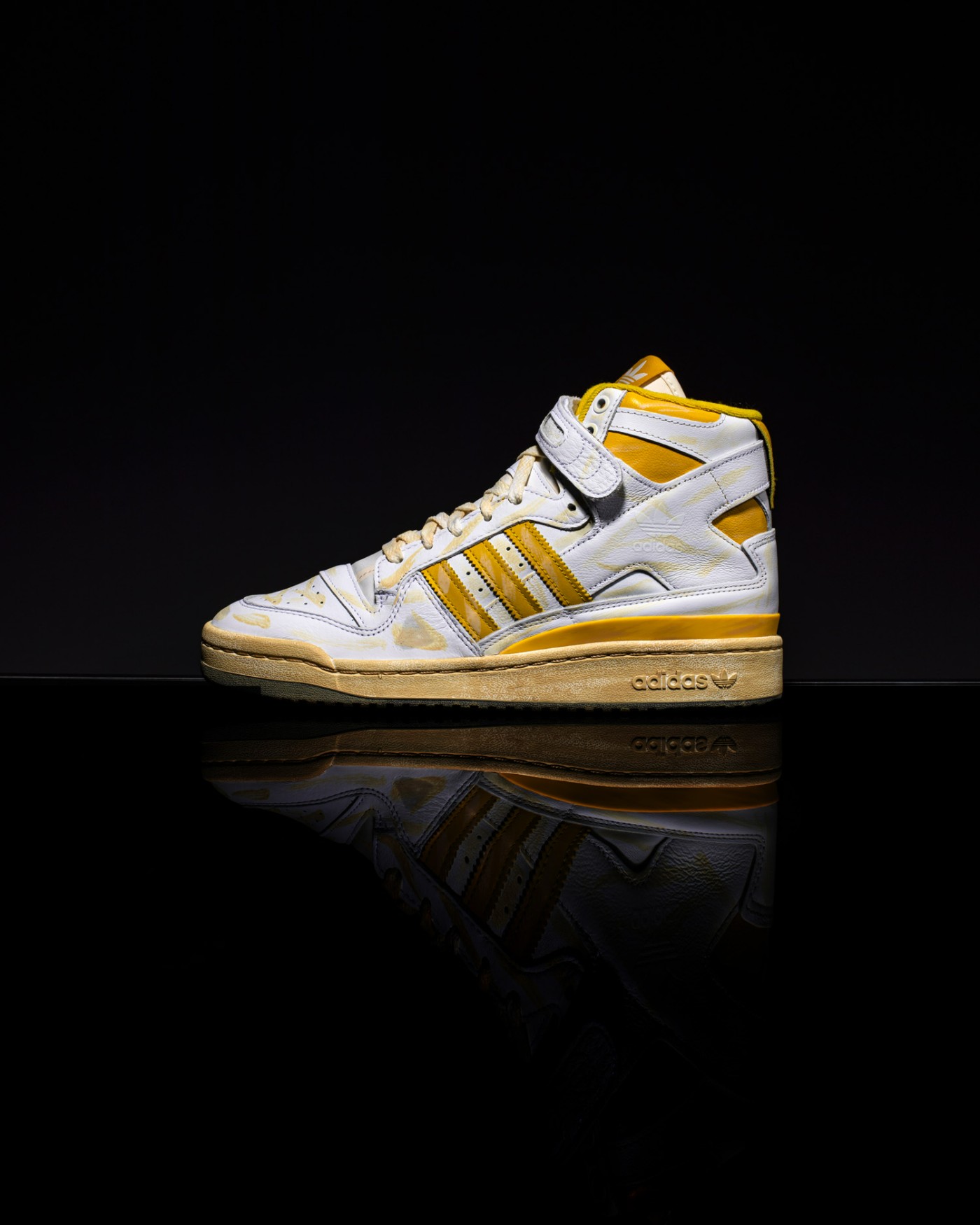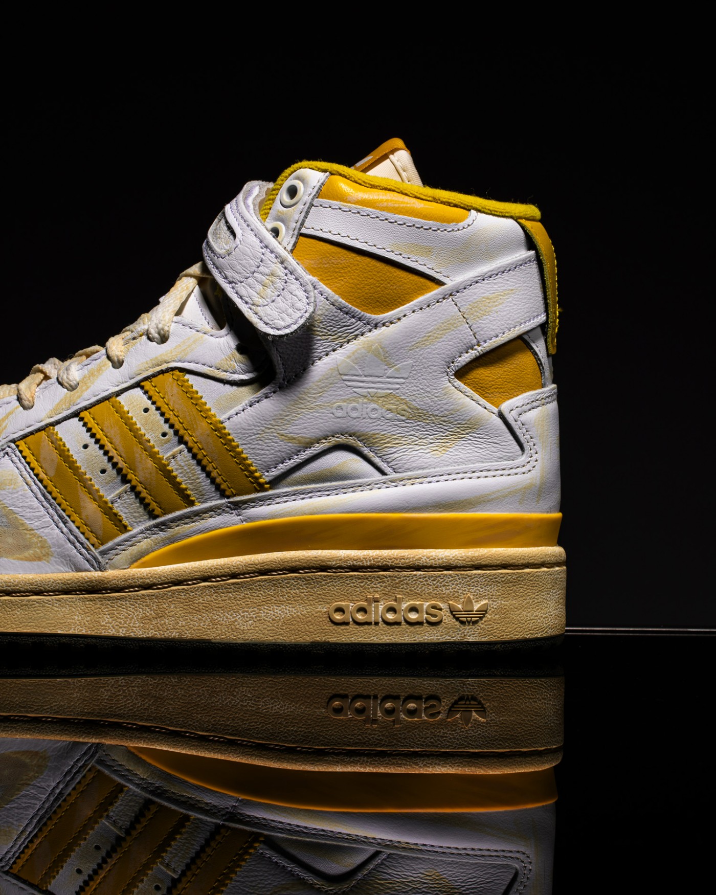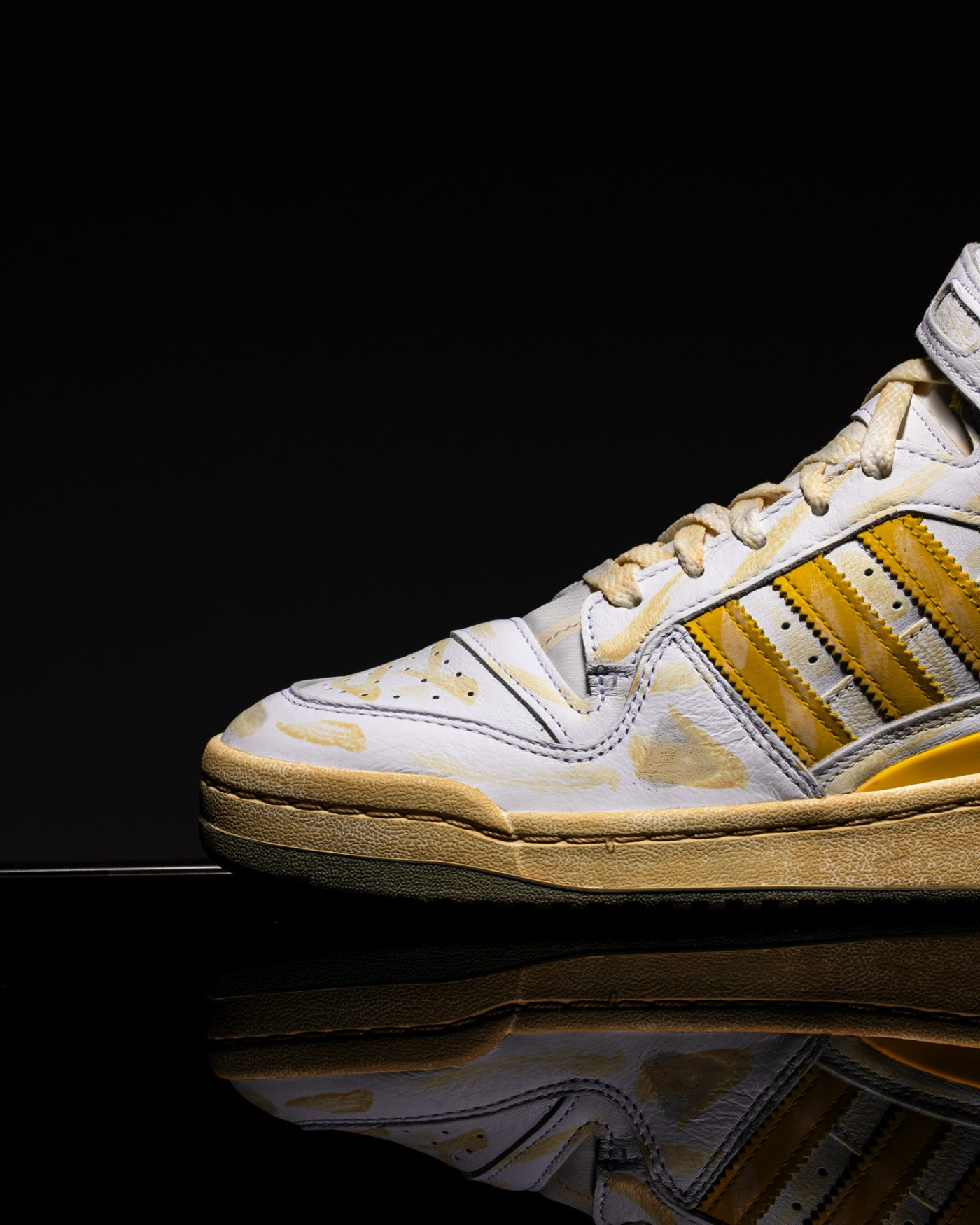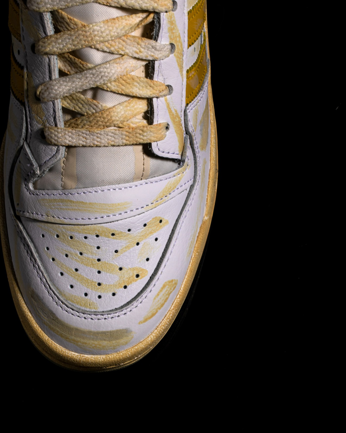 其中颜料涂抹占大多数,氧化黄色的条纹代表鞋子久穿后的划痕和折痕。