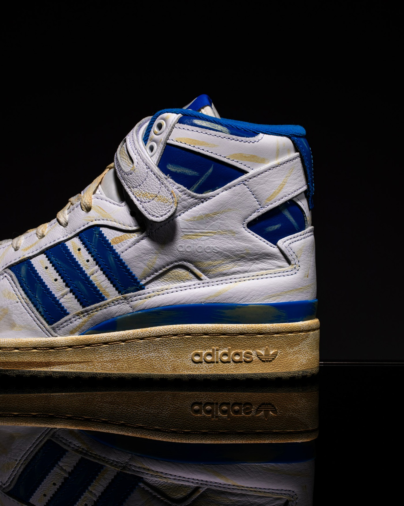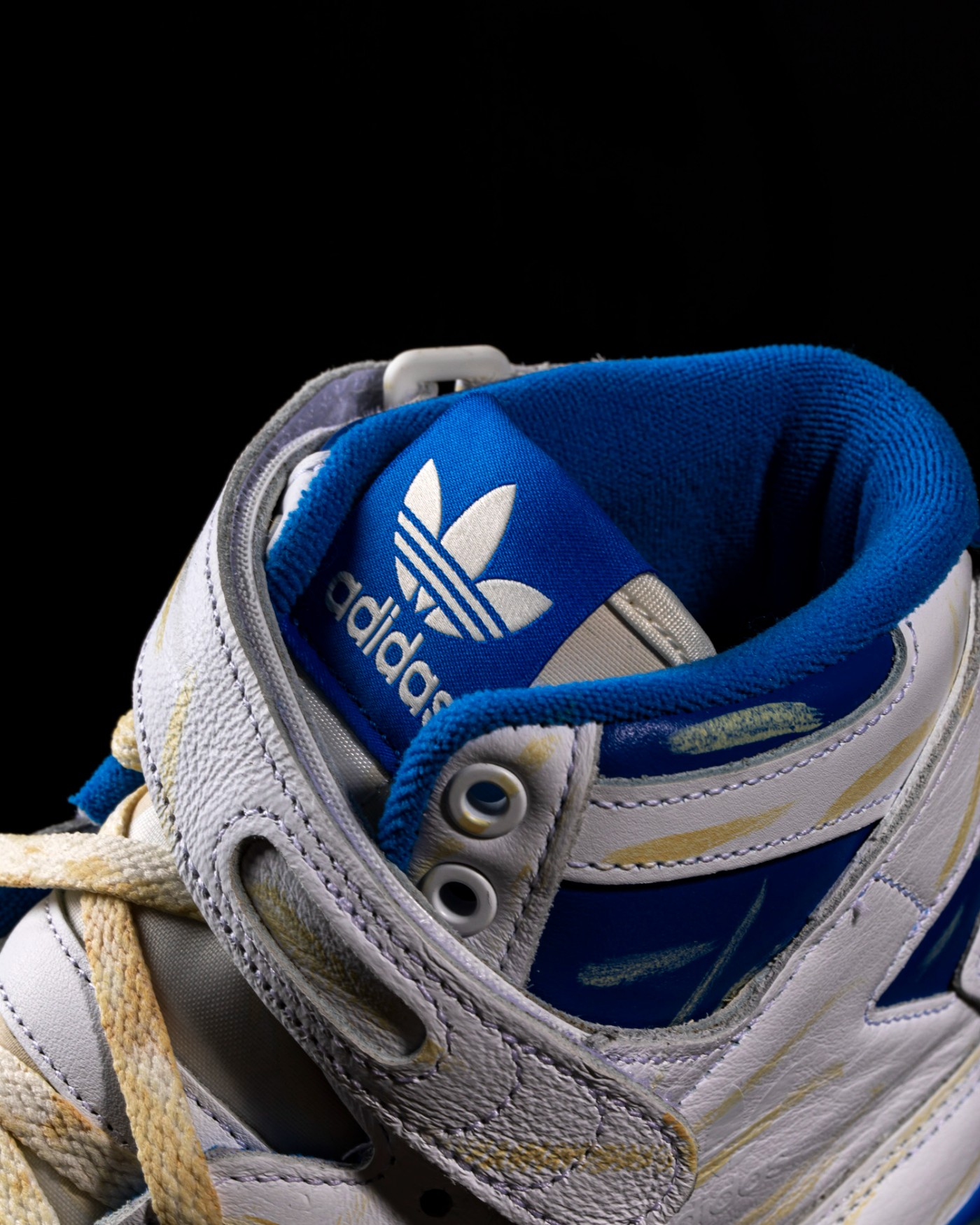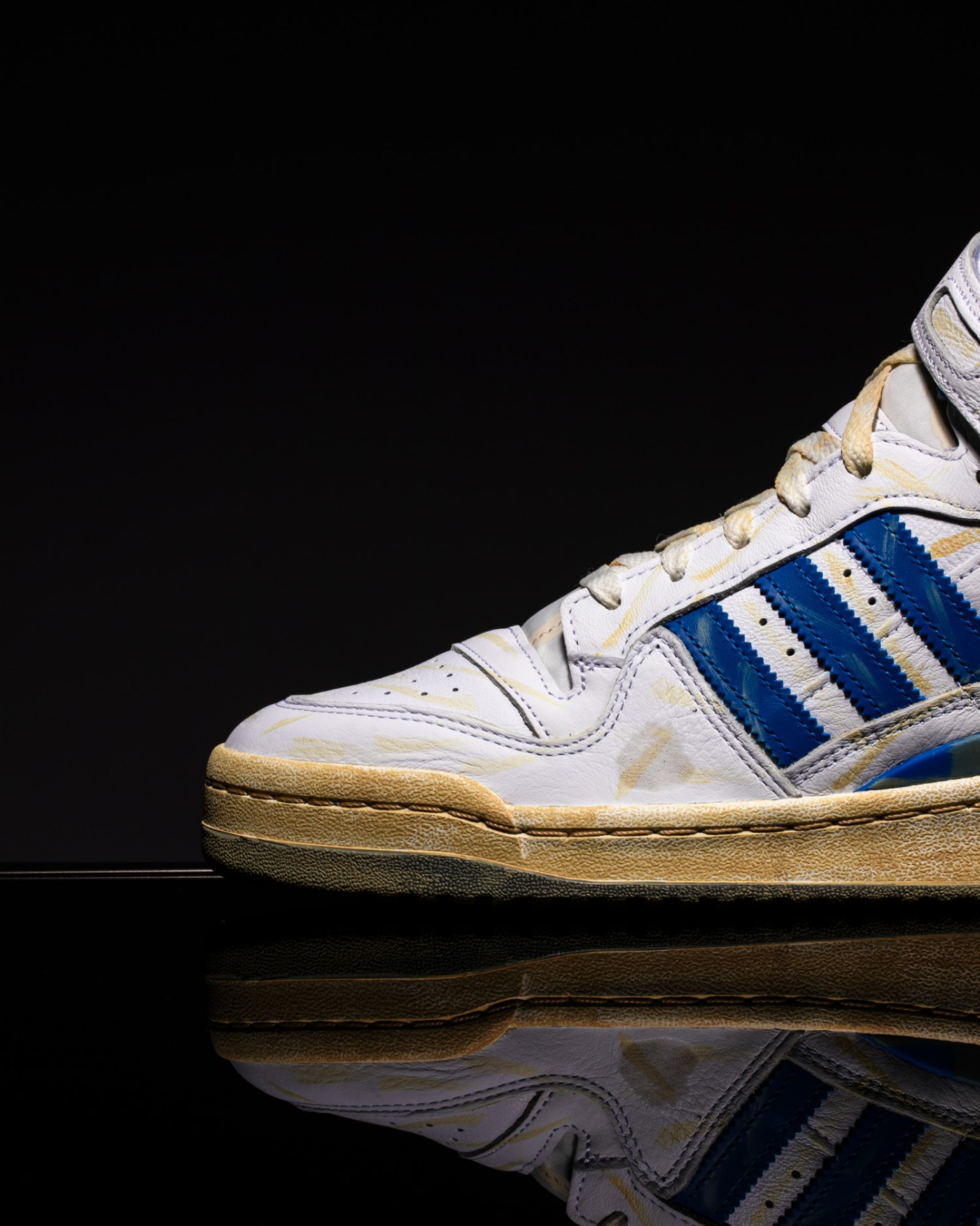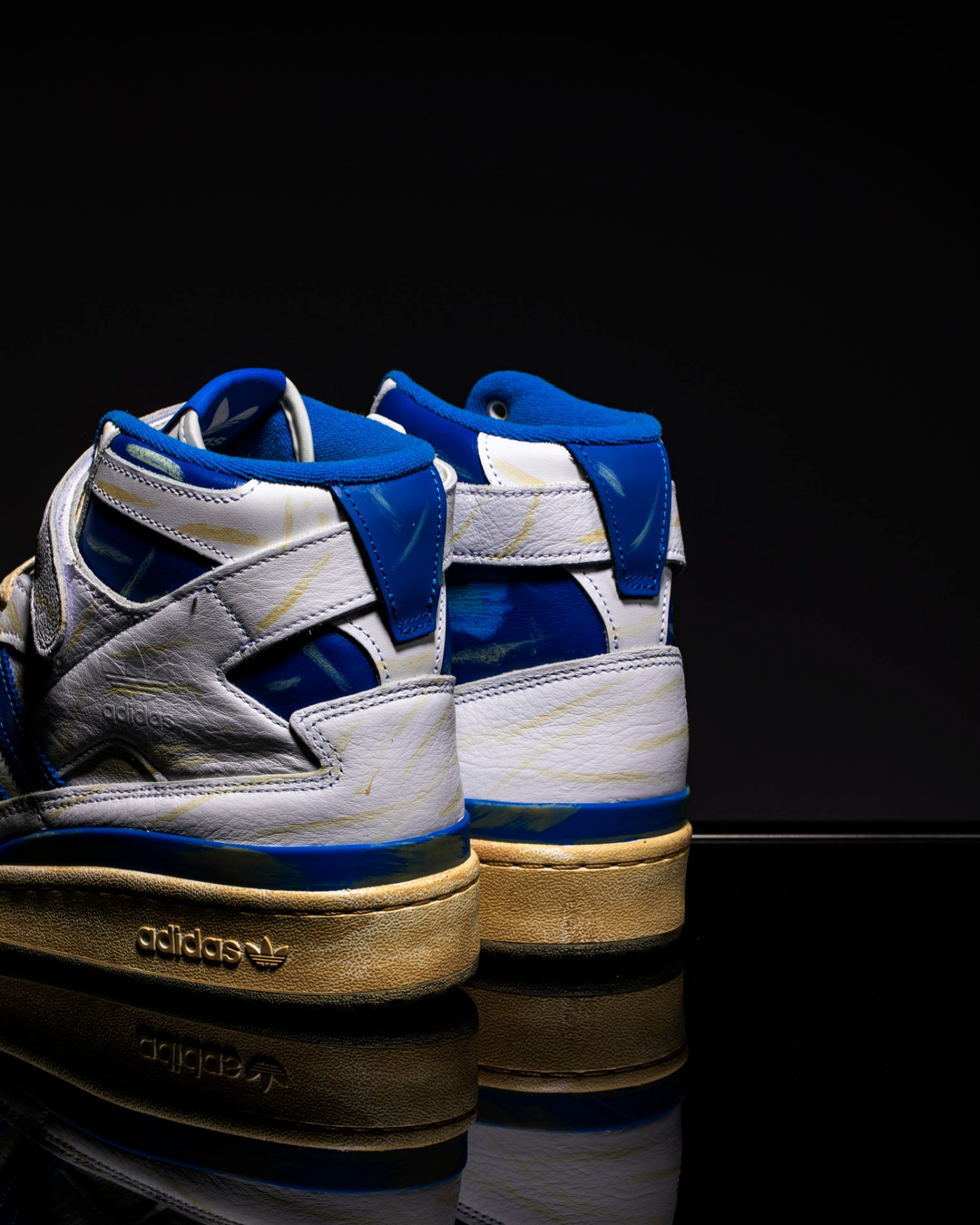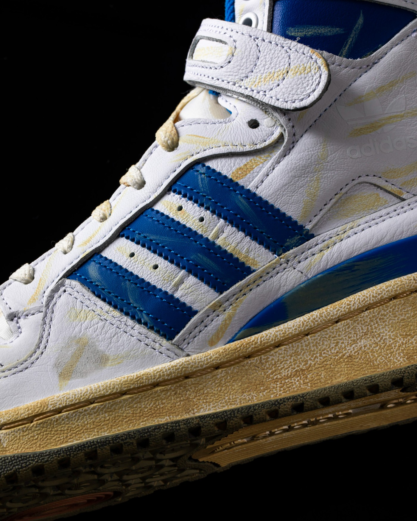 第一款为经典的白蓝配色 Forum,整体材质延续了普通款式的出色质感表现,但在鞋面上追加了大量做旧细节。