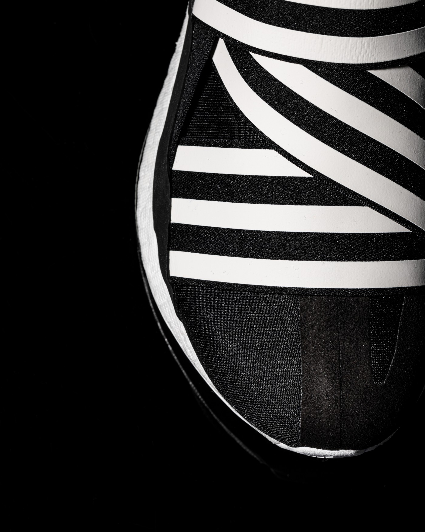 采用 adidas Primeknit 鞋面,无笼套入式结构搭配弹力束带,致敬经典 Y-3 Qasa 鞋款。