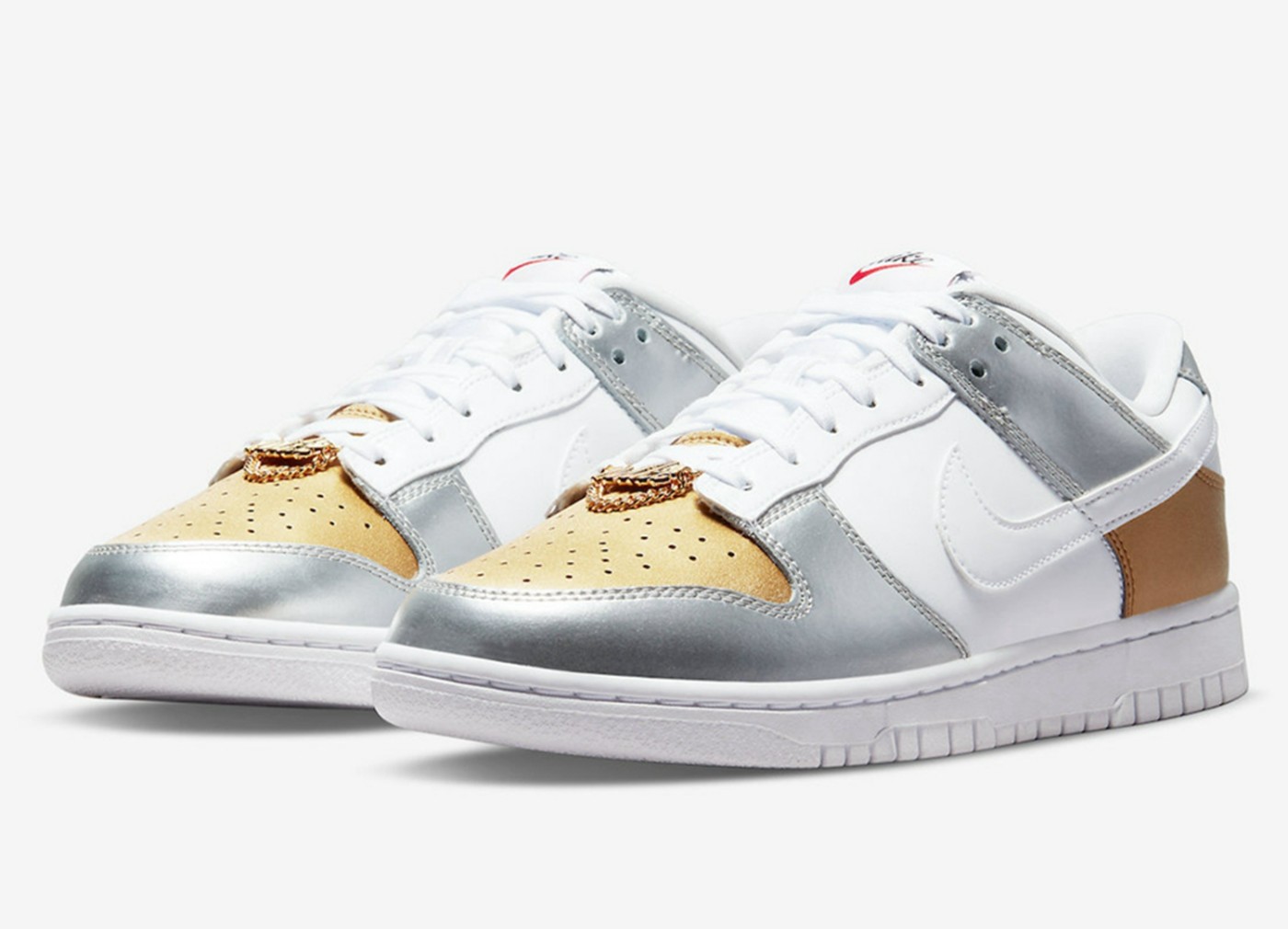 这双 Nike Dunk Low “金链” 在官图刚刚曝光的时候,风评简直不要太差,夸张的金银配色似乎很难被这个时代的审美接受。