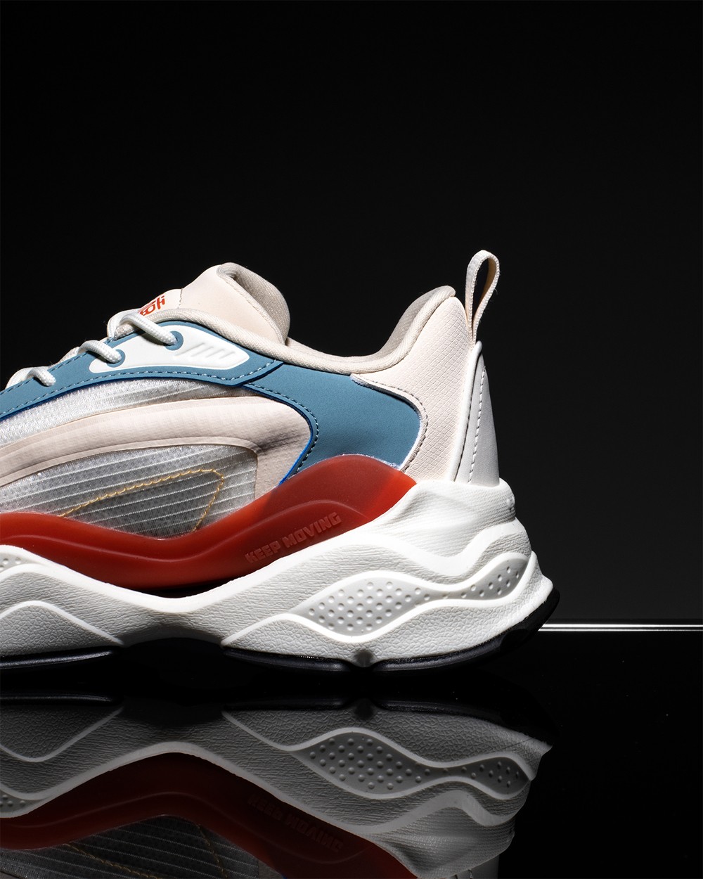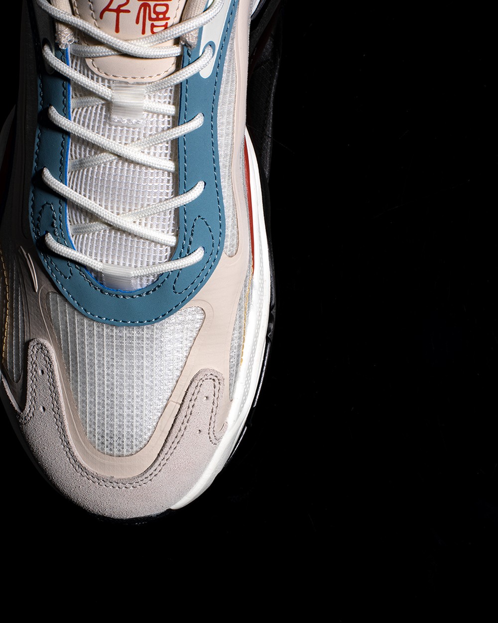 整体以多种材质拼接组成,红蓝撞色搭配鞋身丰富的线条设计,复古感十足。