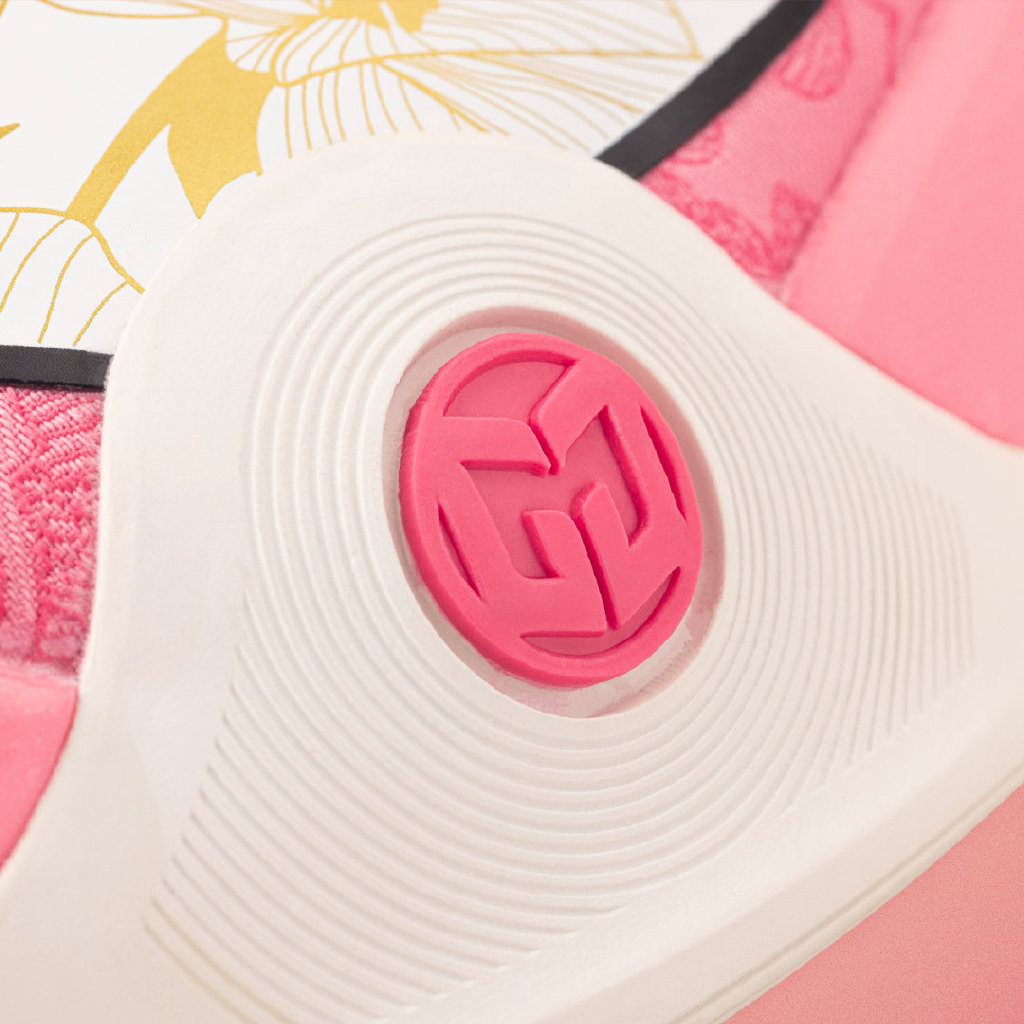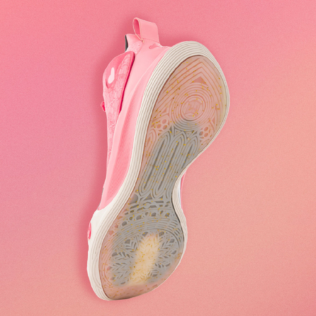 整体采用粉色为主色调,类似之前的玫瑰之城配色,鞋面同样采用提花织物打造。