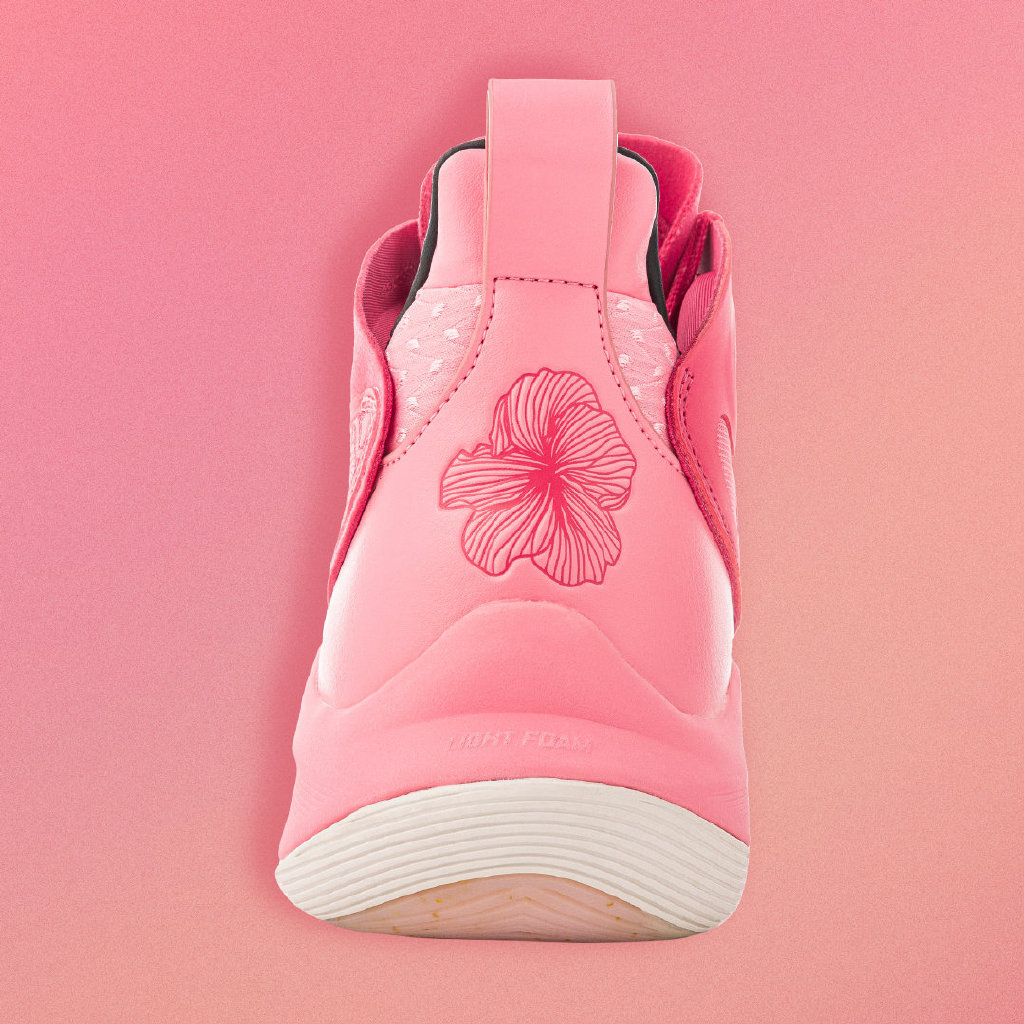 后跟处也有木槿花图案与鞋面设计主题呼应。鞋帮处还有爱心标志,凸显热恋主题。