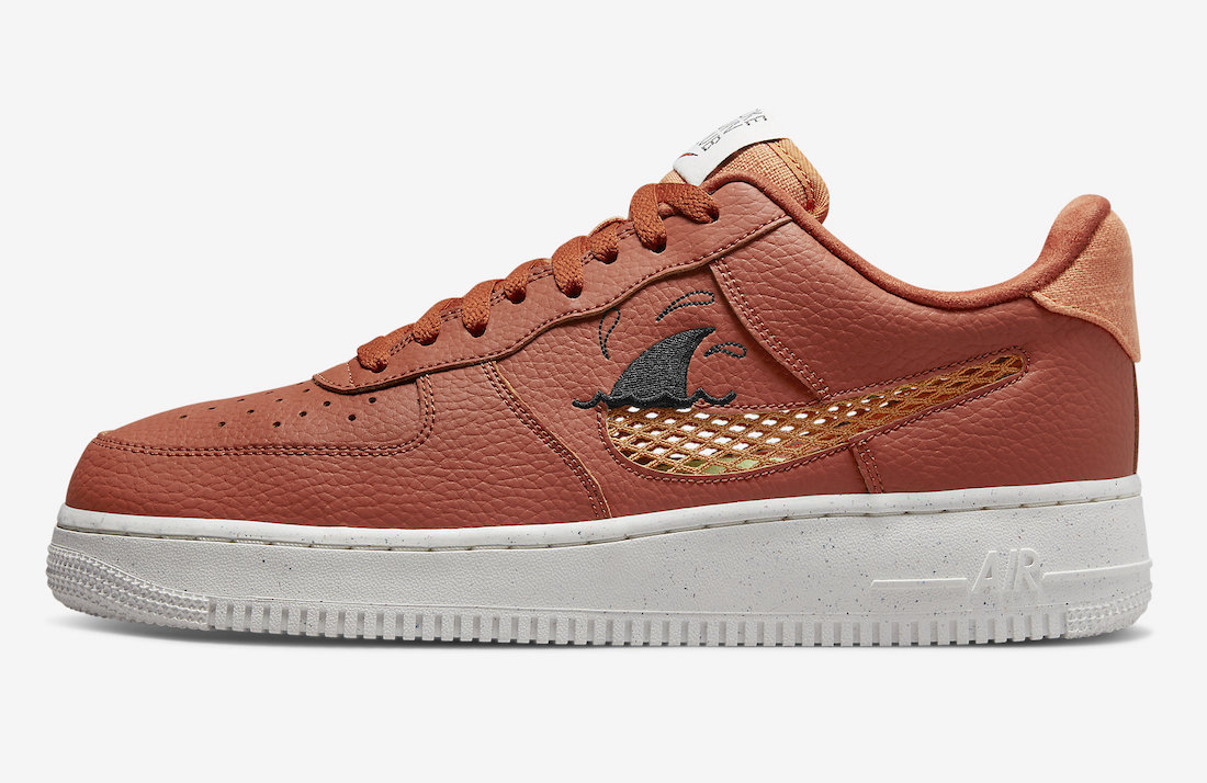 鞋侧 Swoosh Logo 设计十分独特,充满巧思。上半部分是手绘鲨鱼鳍图案,下半部分则为镂空网兜样式,呼应夏日阳光主题。