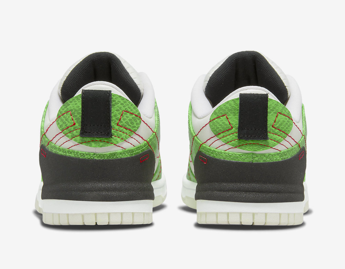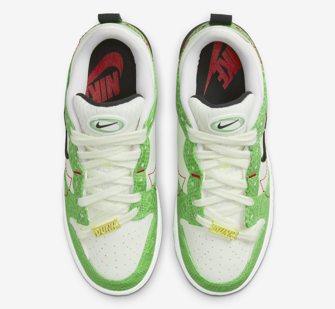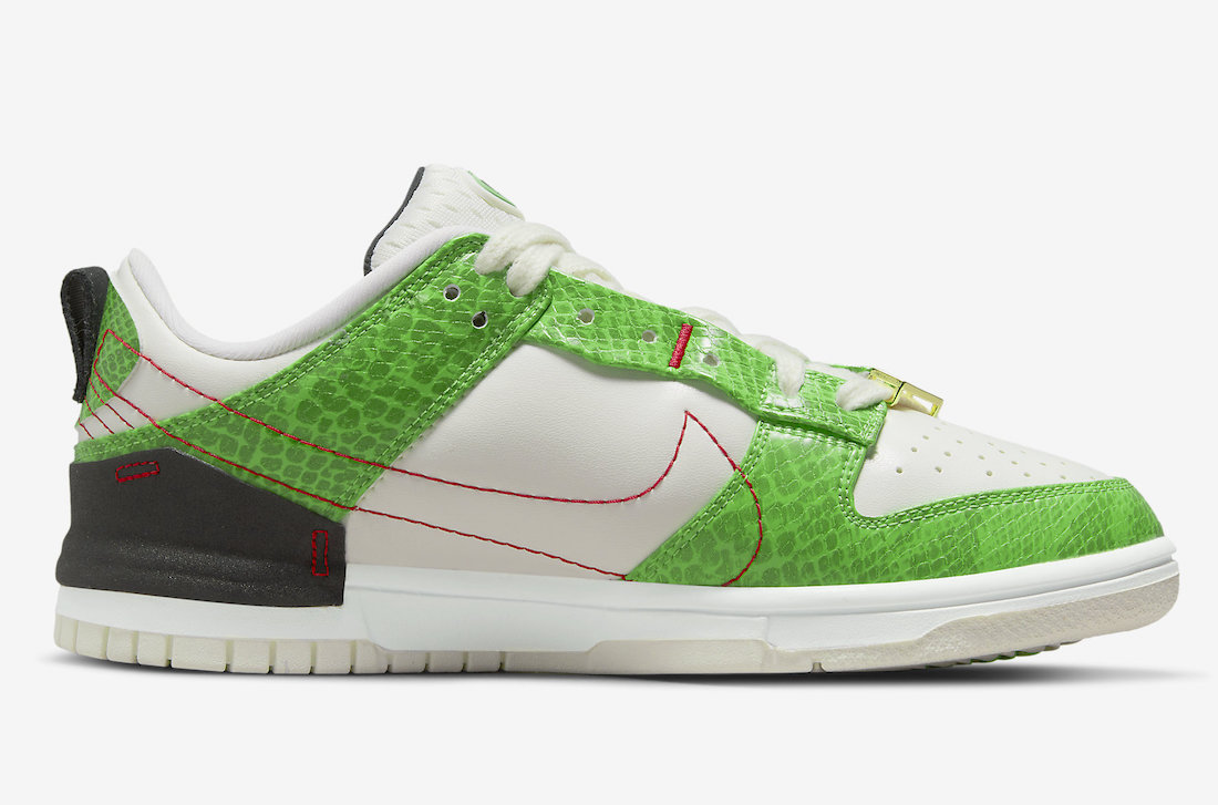 这双 Dunk Low Disrupt 2 采用了亮眼的绿色蛇纹漆皮,搭配白色皮革底座,整体效果十分抓人眼球。