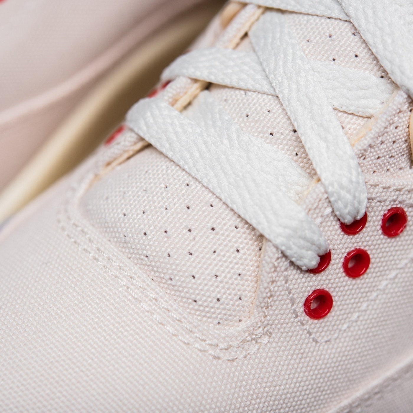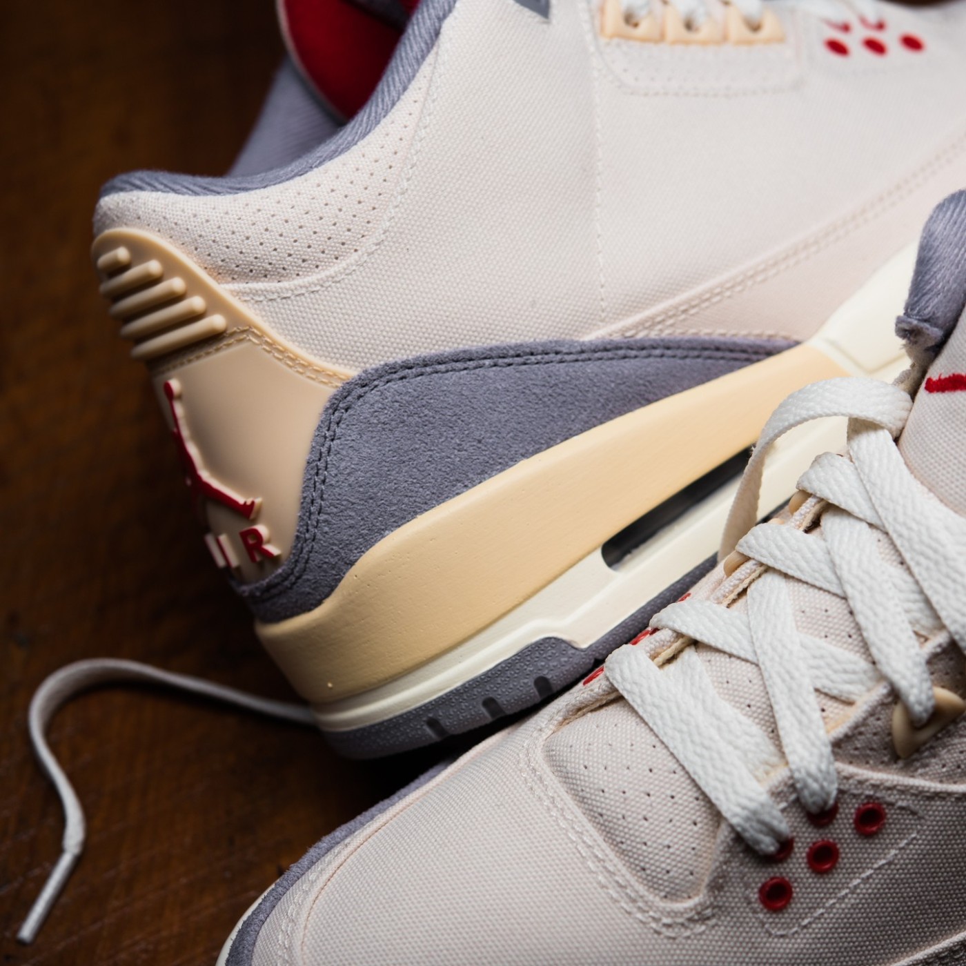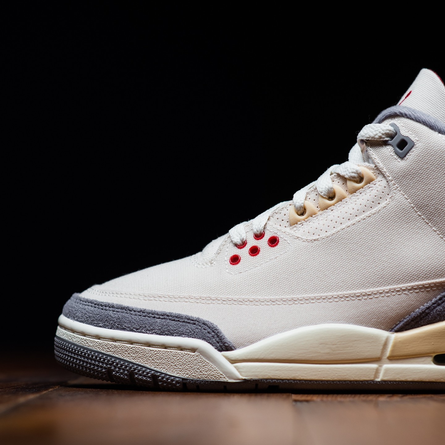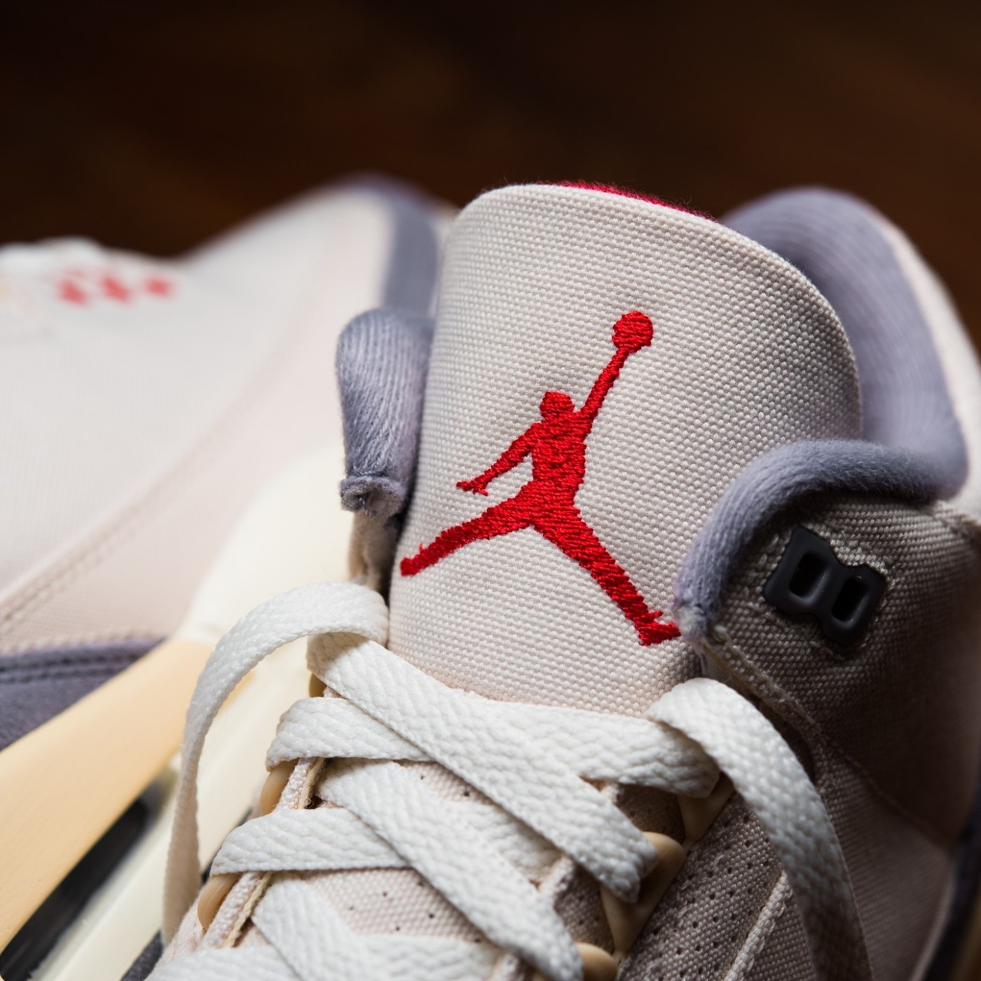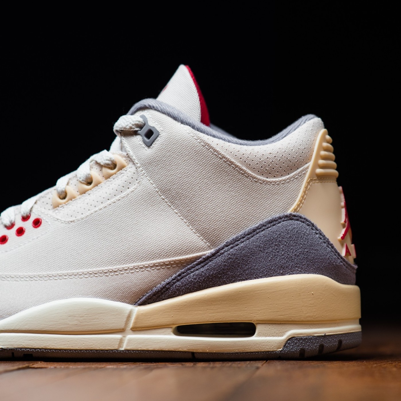 整双鞋从最早曝光开始,就被网友称之为「小 AMM」,鞋面以奶茶色帆布材质打造,营造出与传统皮革材质 Air Jordan 3 完全不同的质感。