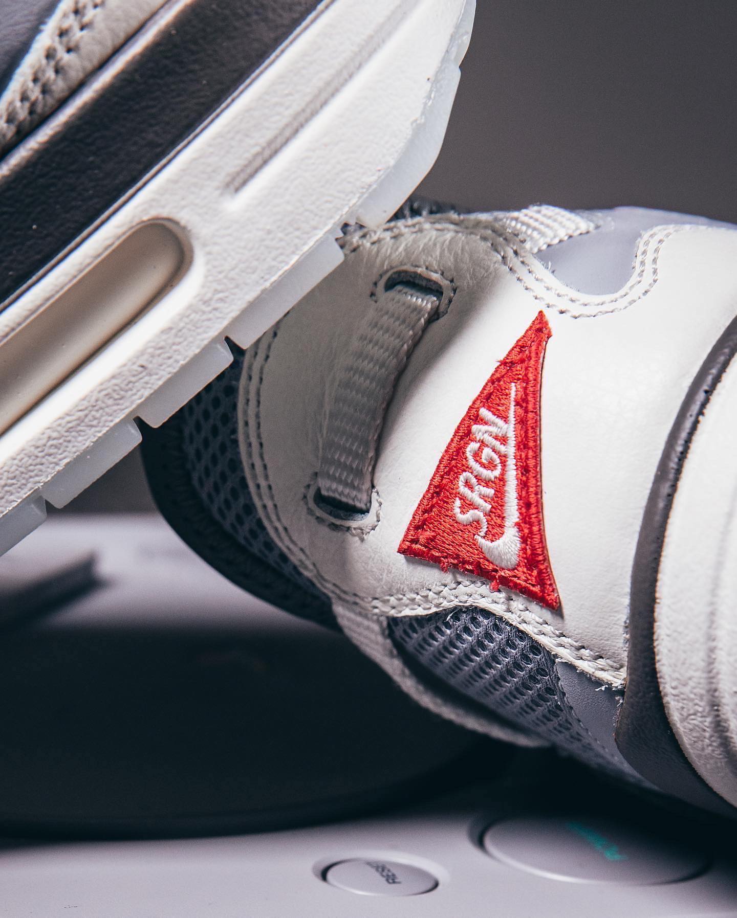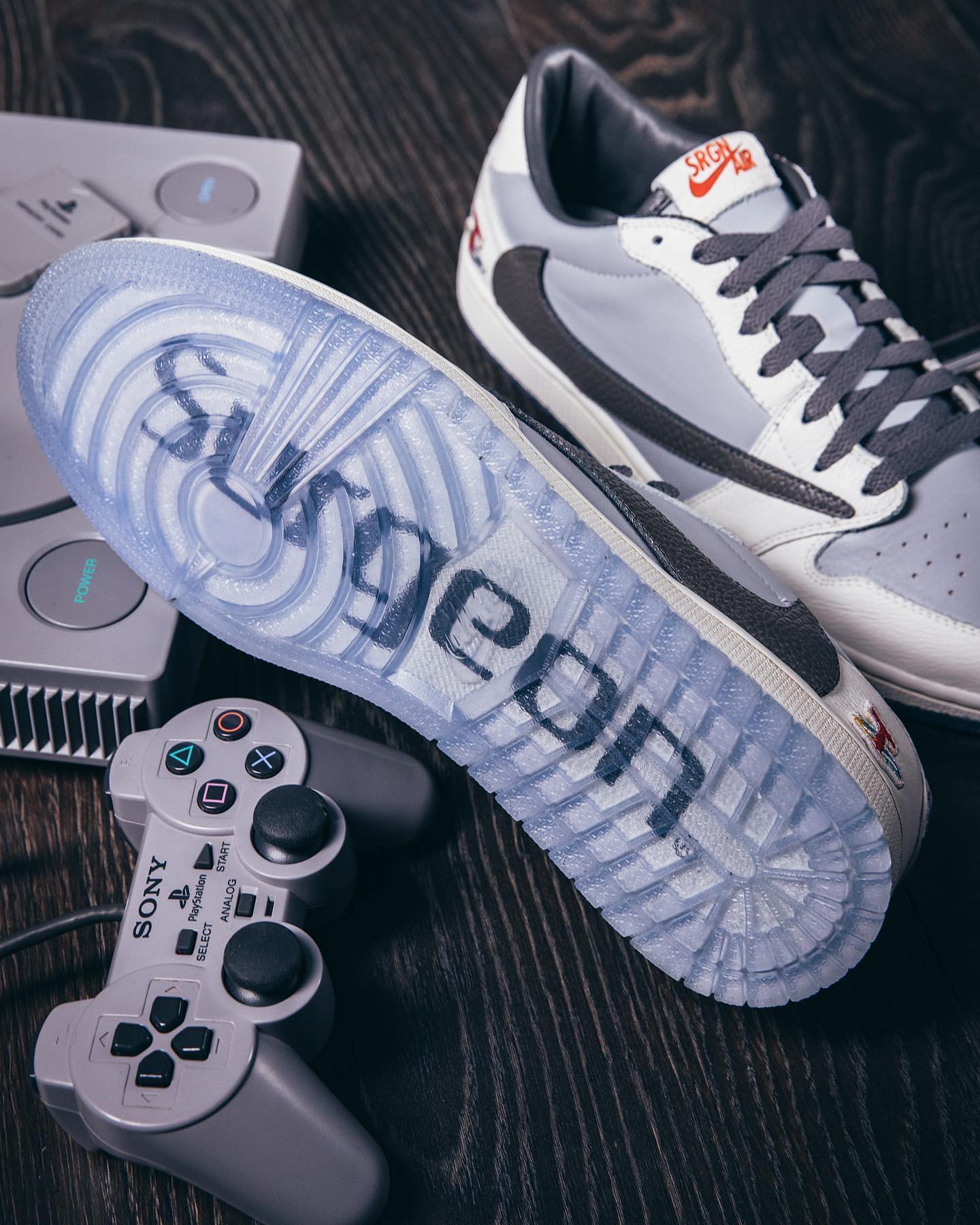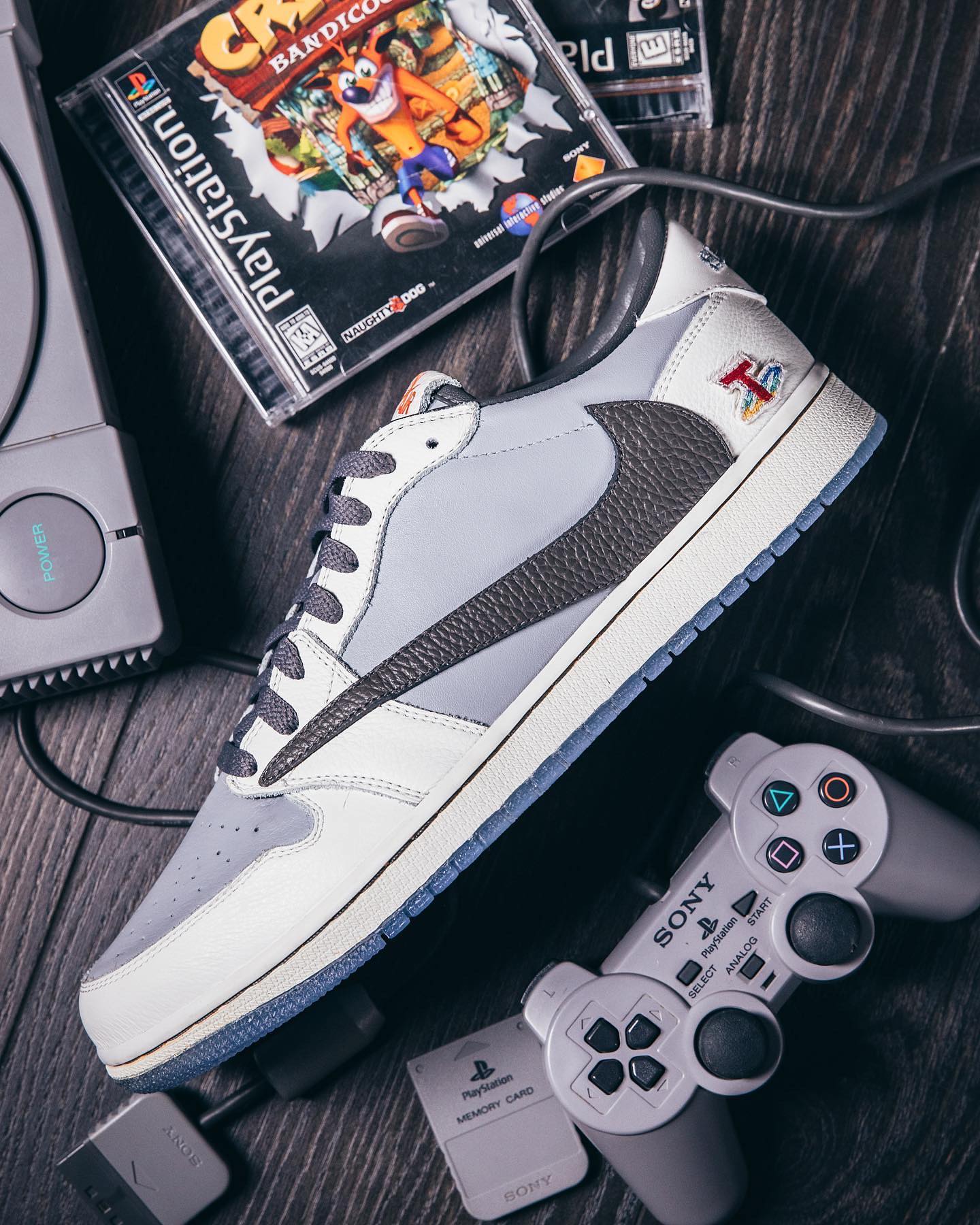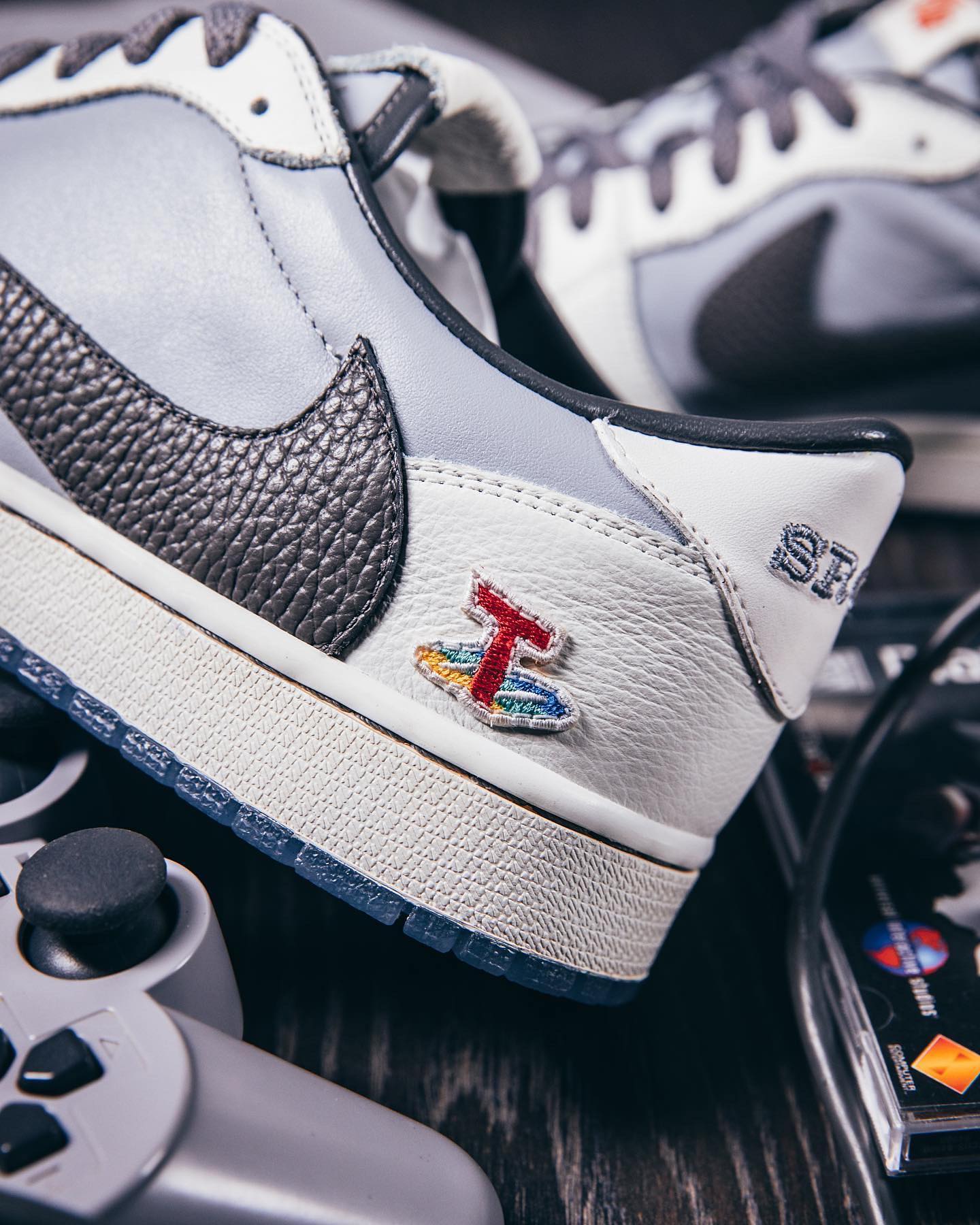 另一款 Air Jordan 1 Low 后跟点缀 PlayStation Logo 呼应主题,颇有一番趣味,鞋侧超大反钩加持,辨识度极高。