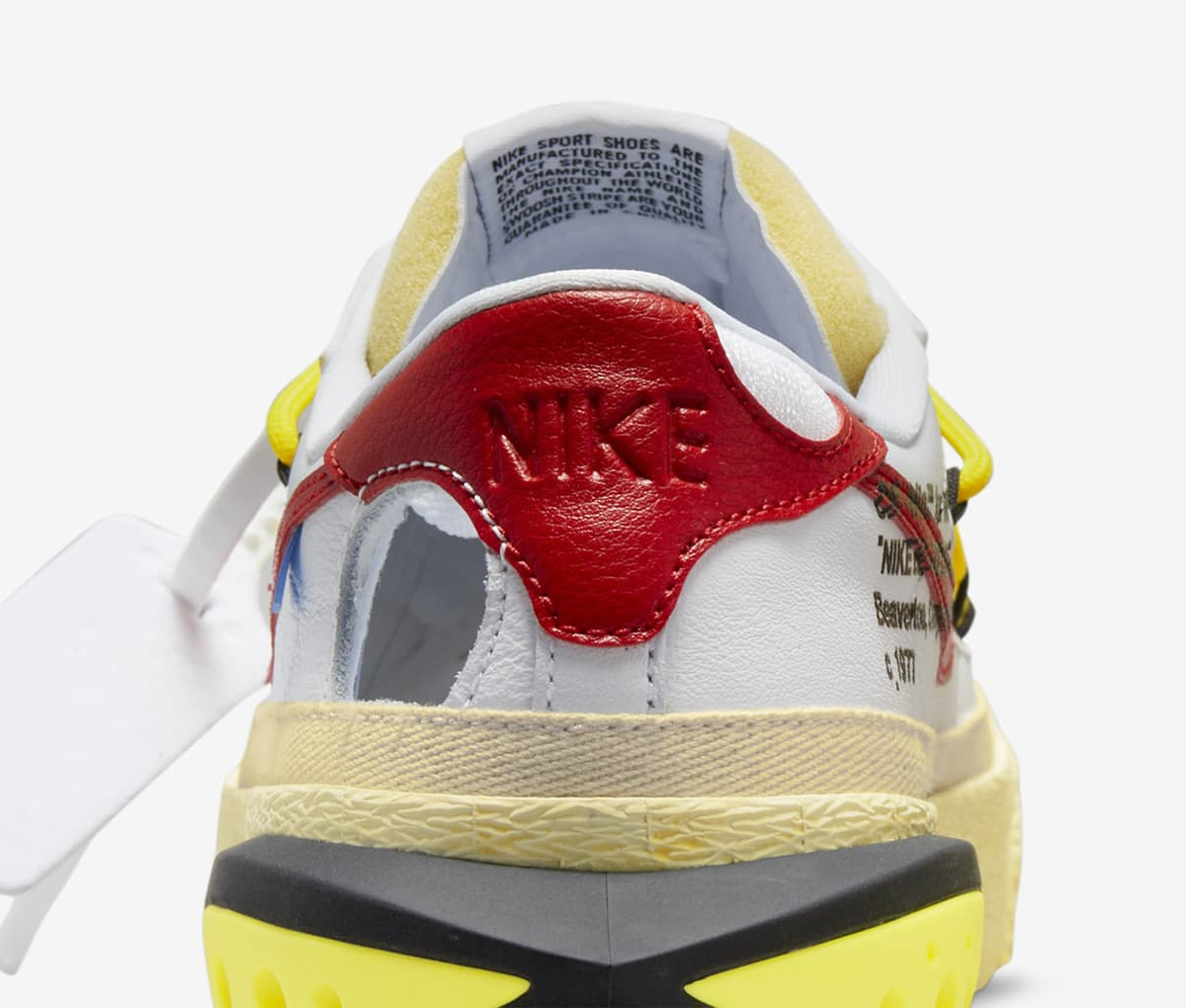 融合了诸多 Virgil 的惯用手法,鞋面的圆形镂空、Zip Tie 束线带、粗犷的海绵鞋舌、横跨鞋面的鞋带,加上细节处的文字装饰,每个角度都是那熟悉的味道。