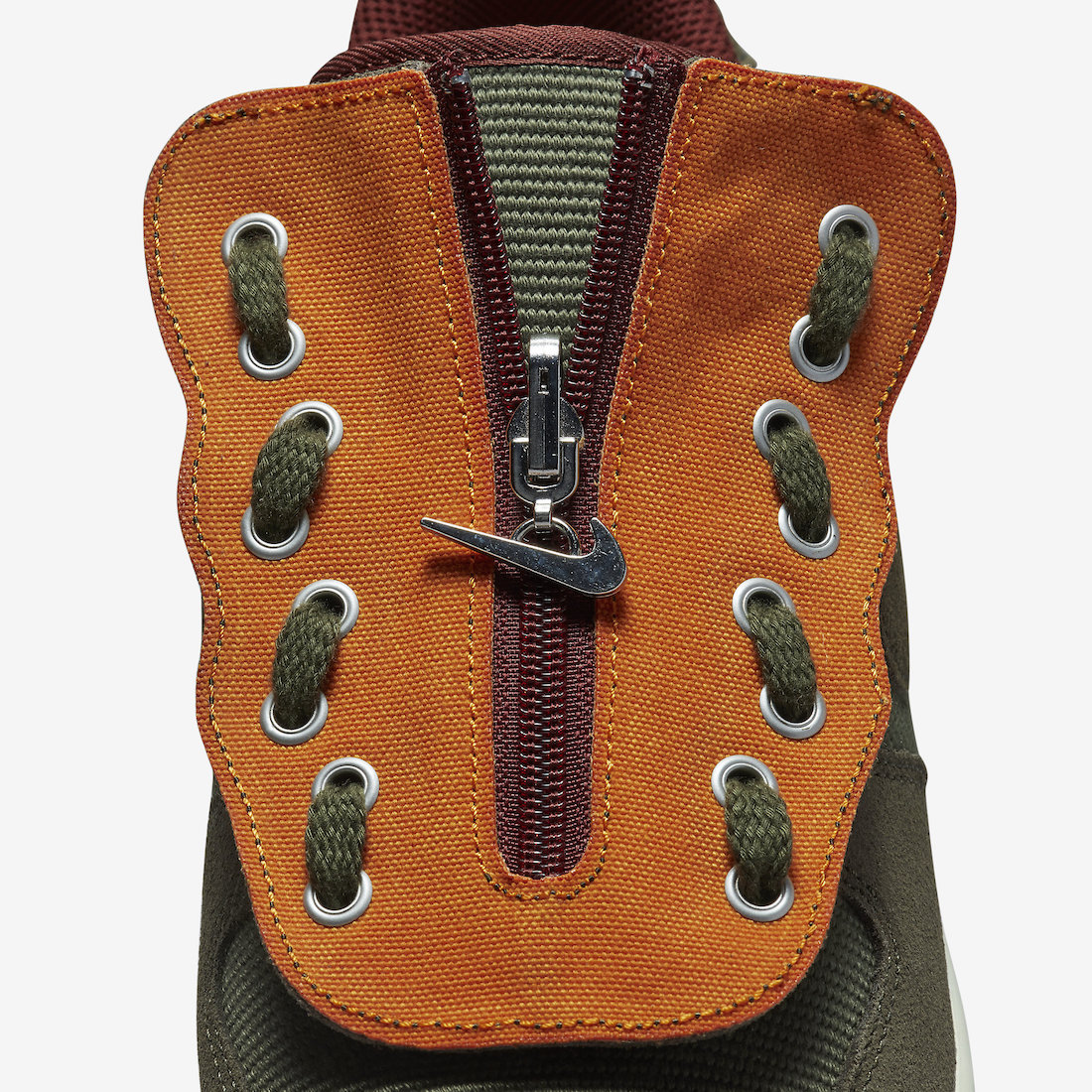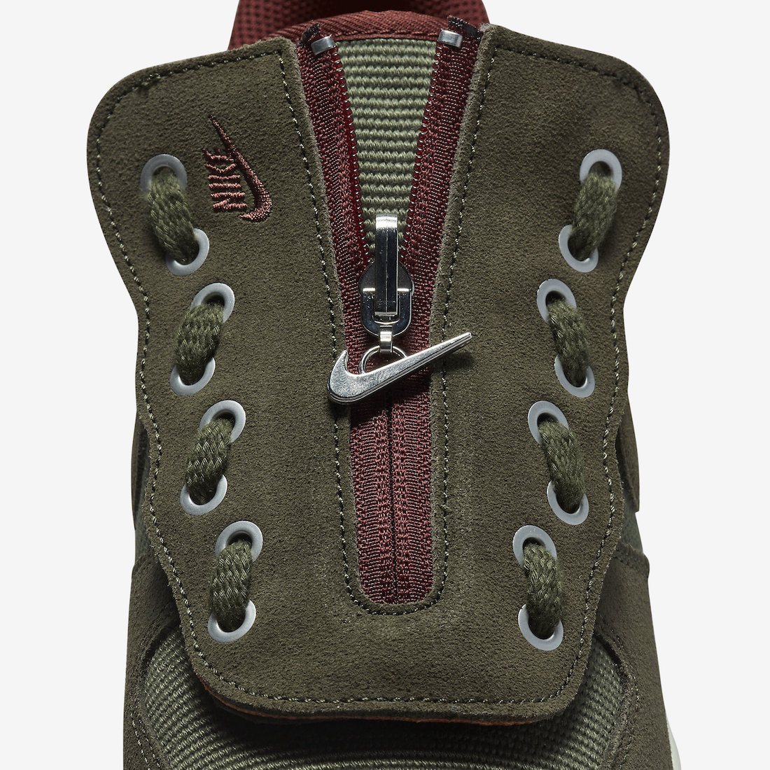 第二双换用了更加军事风的橄榄绿和暗红色,鞋盖内侧则为跳脱亮眼的橙色,似乎更加符合 Travis Scott 的配色风格。