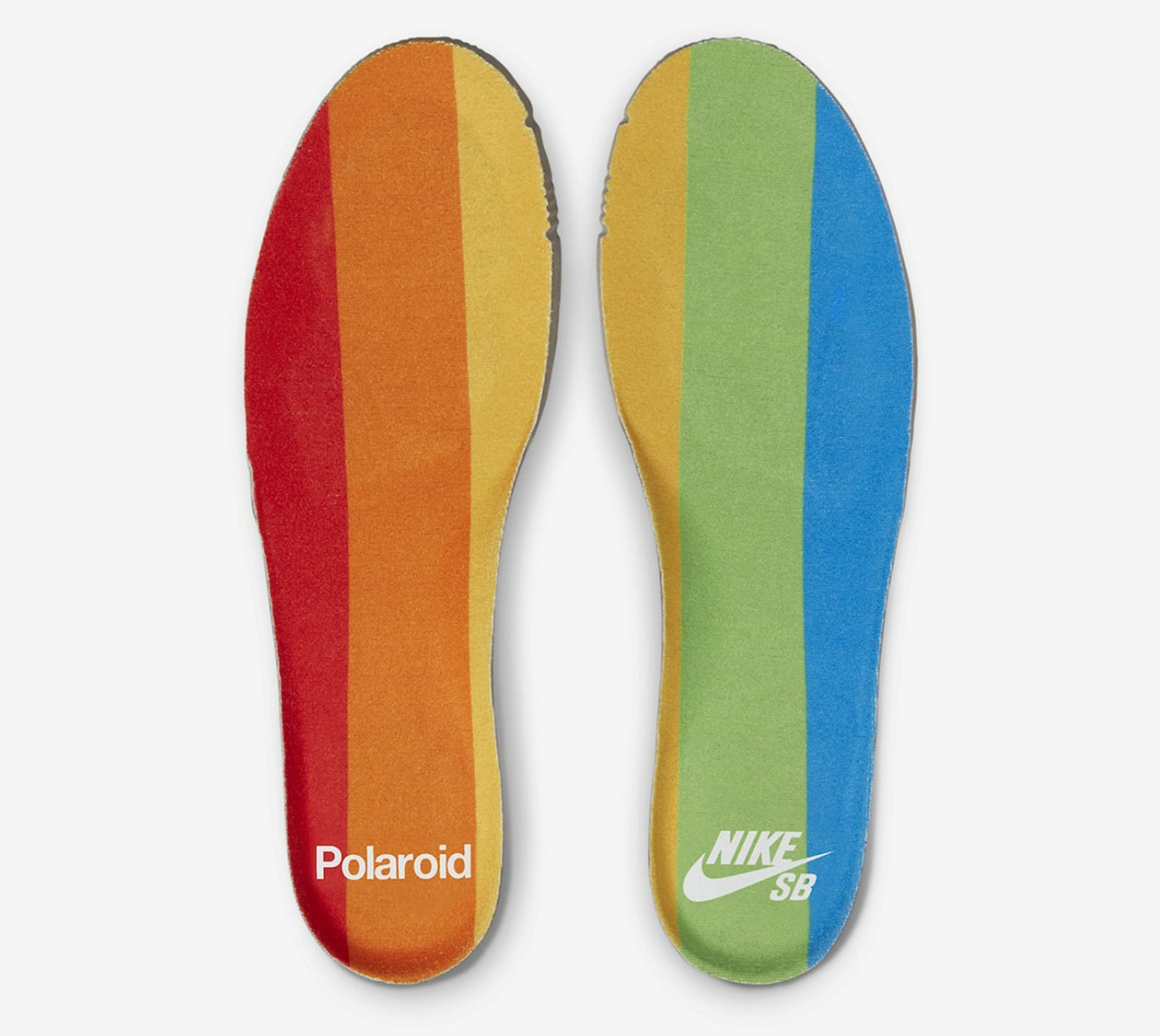鞋侧 Swoosh 采用彩虹色谱叠加呈现,与鞋头彩虹线条及鞋垫还原宝丽来 Logo 的经典元素,缤纷的色彩过渡,相当讨喜。