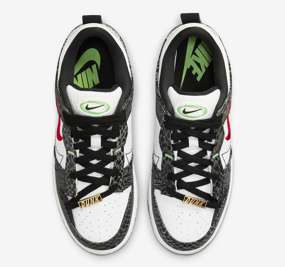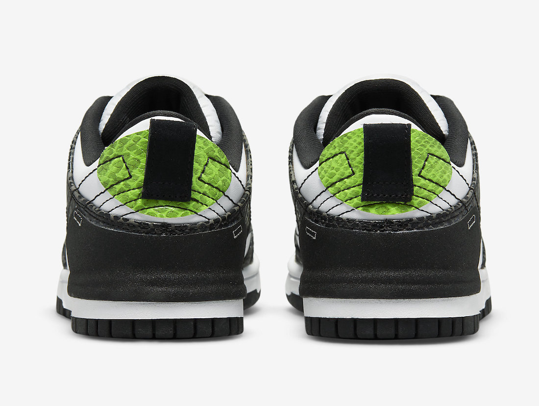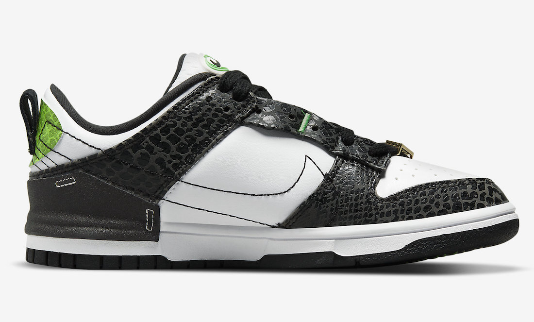 这双 Dunk Low Disrupt 2 整体以经典「熊猫」配色方案为蓝本,黑色部分换用蛇纹漆皮,搭配白色皮革底座,后跟处保留一小块绿色蛇纹漆皮材质,整体效果十分抓人眼球。