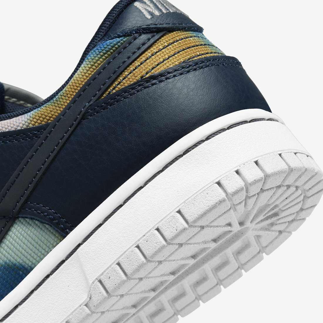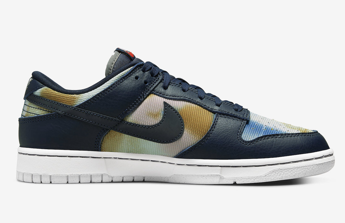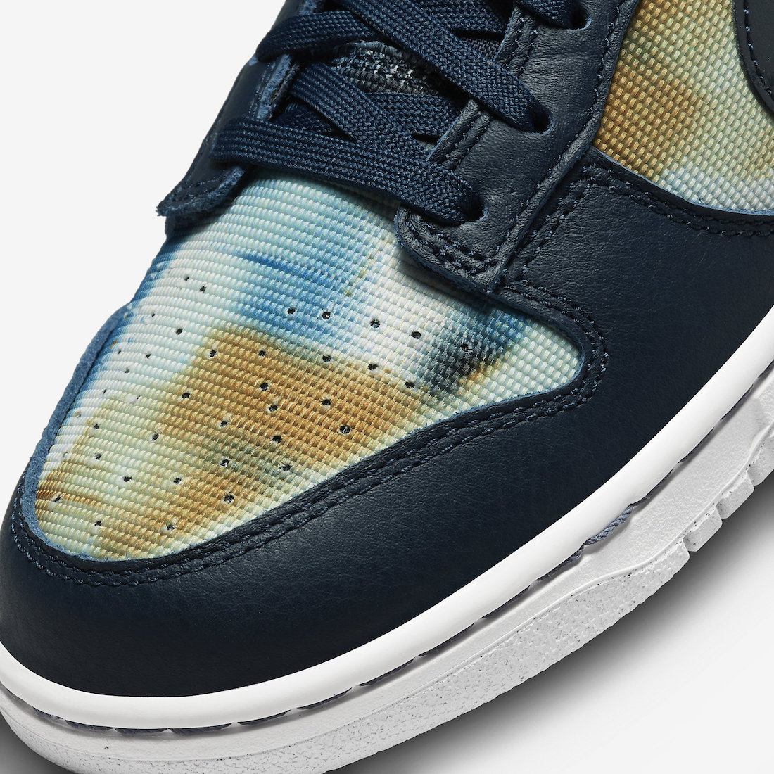 不同于前作,这双鞋的鞋身框架部分保留 Dunk 传统的海军蓝皮质材料,仅基底部分采用涂鸦风格帆布,整体风格不至于过分花哨。